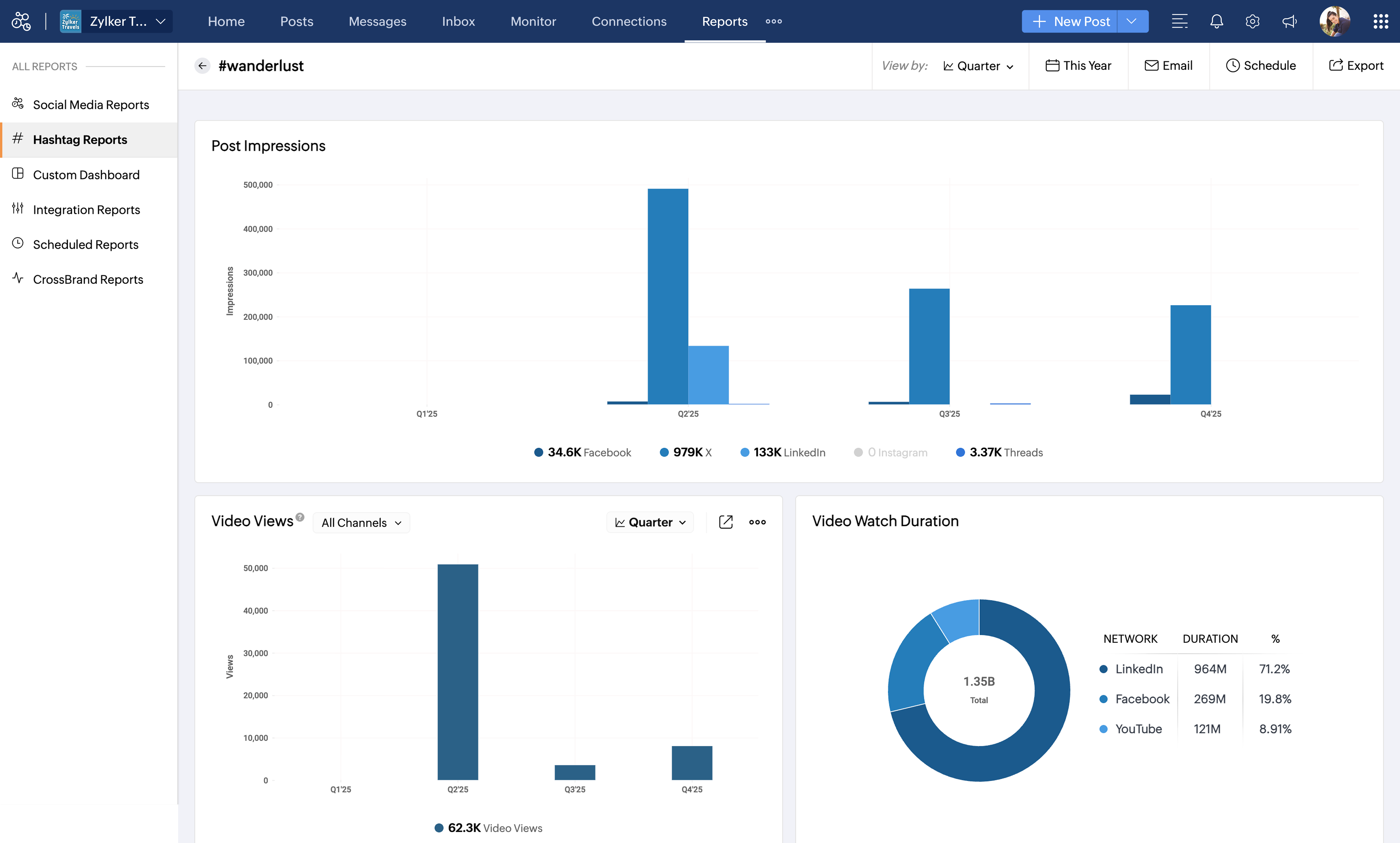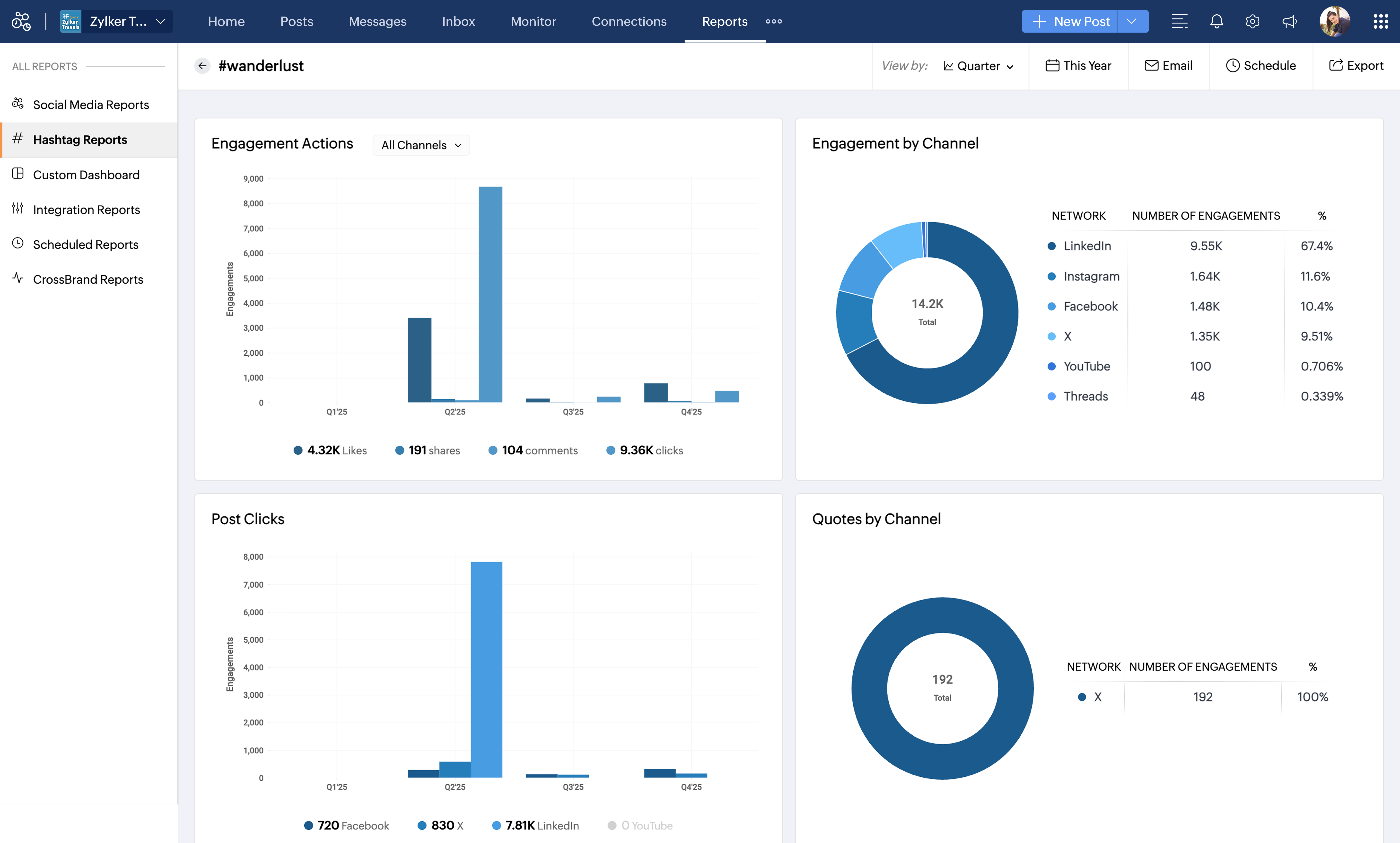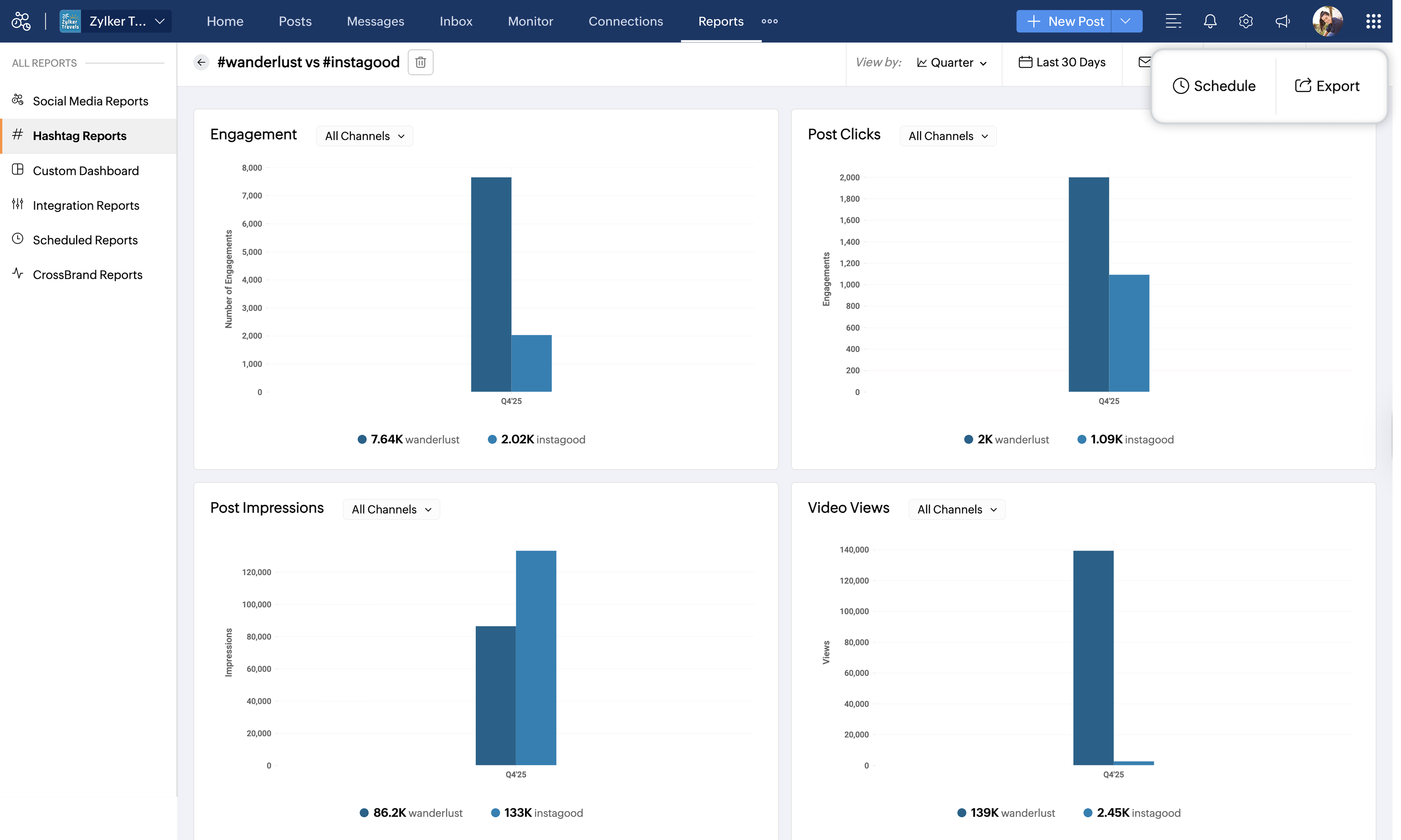 これらのハッシュタグを組み合わせて使用することで、表示回数が増え、ターゲットオーディエンスへのリーチが向上し、Zylker Travelsが適切なタイミングで適切な人々にアプローチできます。