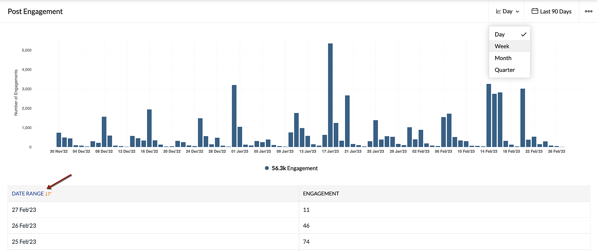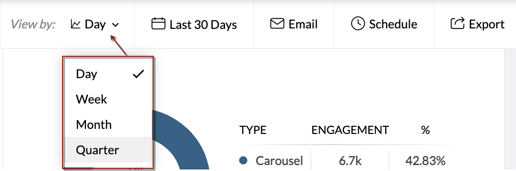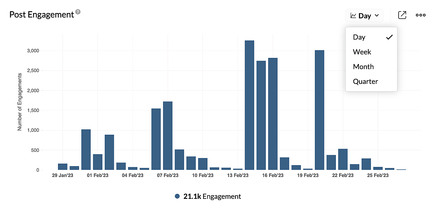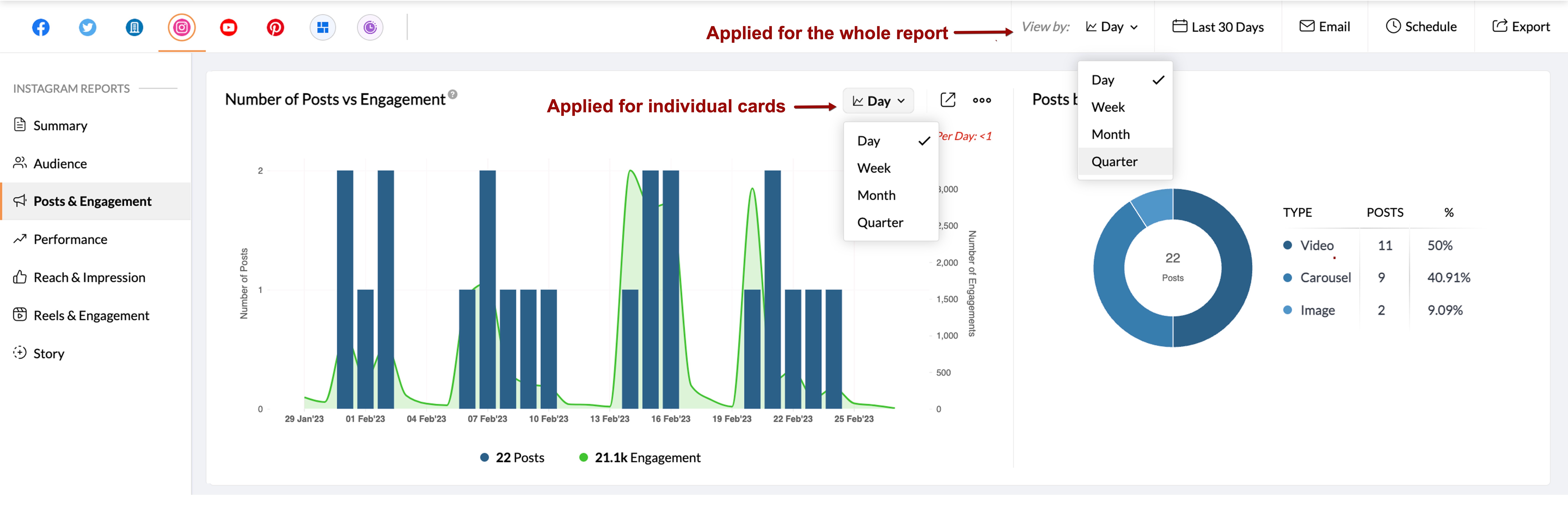 レポートには複数のカードが表示されます。各カードには、ソーシャルメディアの各種指標データがグラフや表として表示されます。Zoho Socialでは、レポート全体での日付の範囲の指定に加えて、レポート内の各カードにおいて日付の範囲の単位を個別に指定することもできます。日付の範囲の単位として、四半期、月、週、日のいずれかを選択することが可能です。
