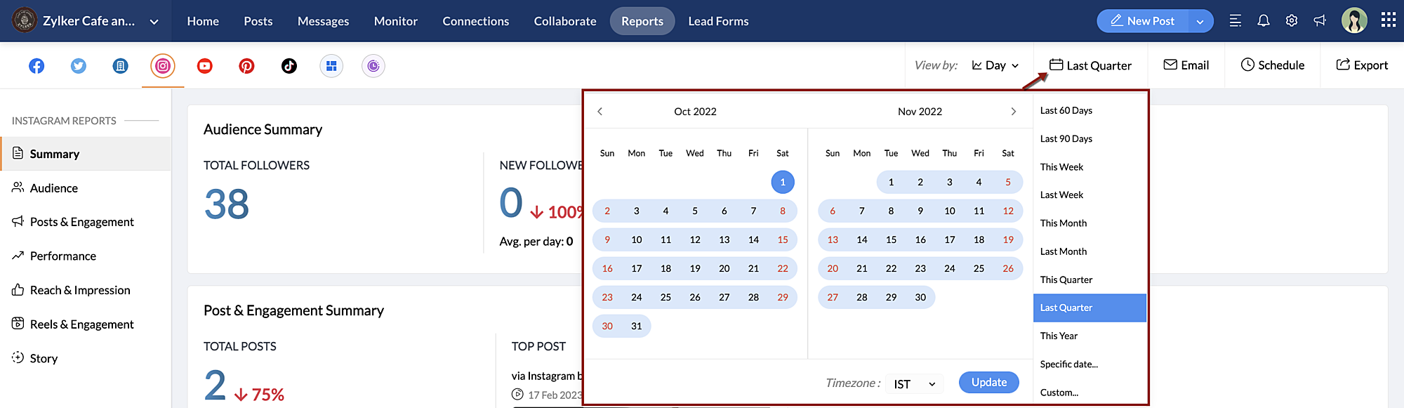 Zoho Socialの[レポート]タブでは、各種ソーシャルメディアに関する指標データを確認できます。[レポート]タブで指標データを確認するにあたって、日付の範囲のフィルターを適用することが可能です。これにより、特定の期間の指標データを簡単に確認することができます。また、レポート内の各カードにおいて、日付の範囲の単位を個別に指定することも可能です。日付の範囲の単位として、四半期、月、週、日のいずれかを選択できます。