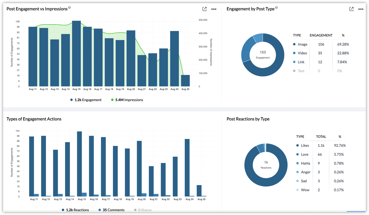 エンゲージメントでのアクションの種類:「いいね!」、コメント、共有(シェア)などの投稿に対する反応の種類、各種類の反応回数に関するグラフが表示されます。