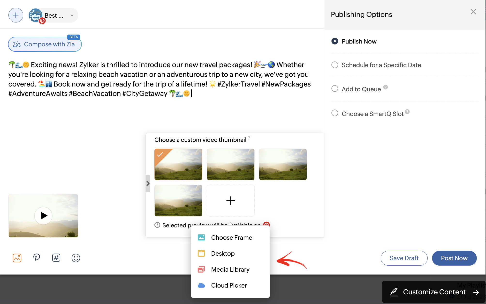 5. 投稿する画像や動画を添付するには、画面下部にある  (メディアアイコンをクリックします。画像は、デスクトップ、ファイルライブラリー、クラウドサービス(Zoho WorkDrive、Google ドライブ、Box、Microsoft OneDrive、Dropbox、Evernote)から選択するか、Canvaで作成することができます。