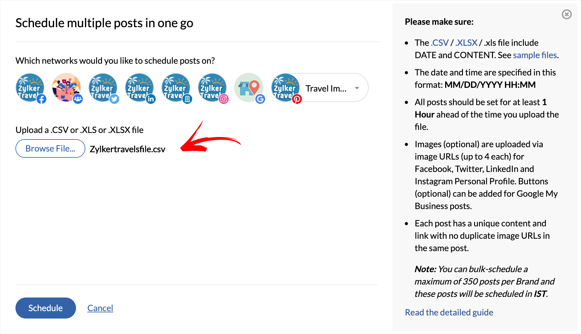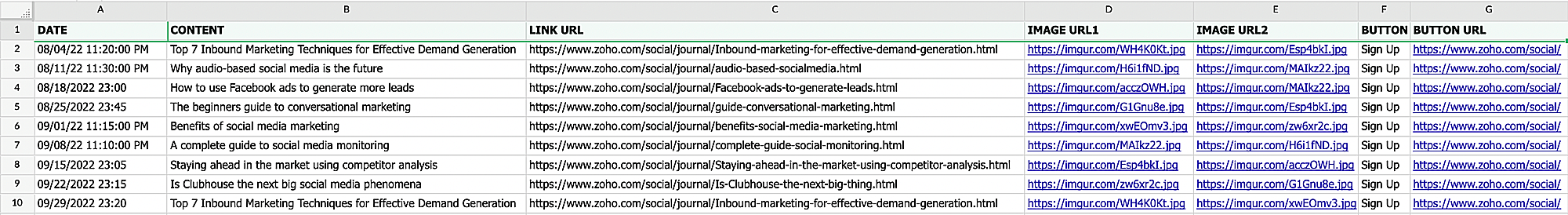 Zoho Socialを使用すると、Pinterestアカウントのボードへの複数の投稿を、まとめて予約できます。予約用のデータは、CSV、XLS、XLSX形式でアップロードできます。投稿する画像は、URLから取り込まれます。そのため、公開されている画像のURLを指定する必要があります。ファイルの異なる列に、画像URL1、画像URL2のように追加することで、複数の画像を追加することができます。ファイルのデータは、以下の画像のように入力してください: