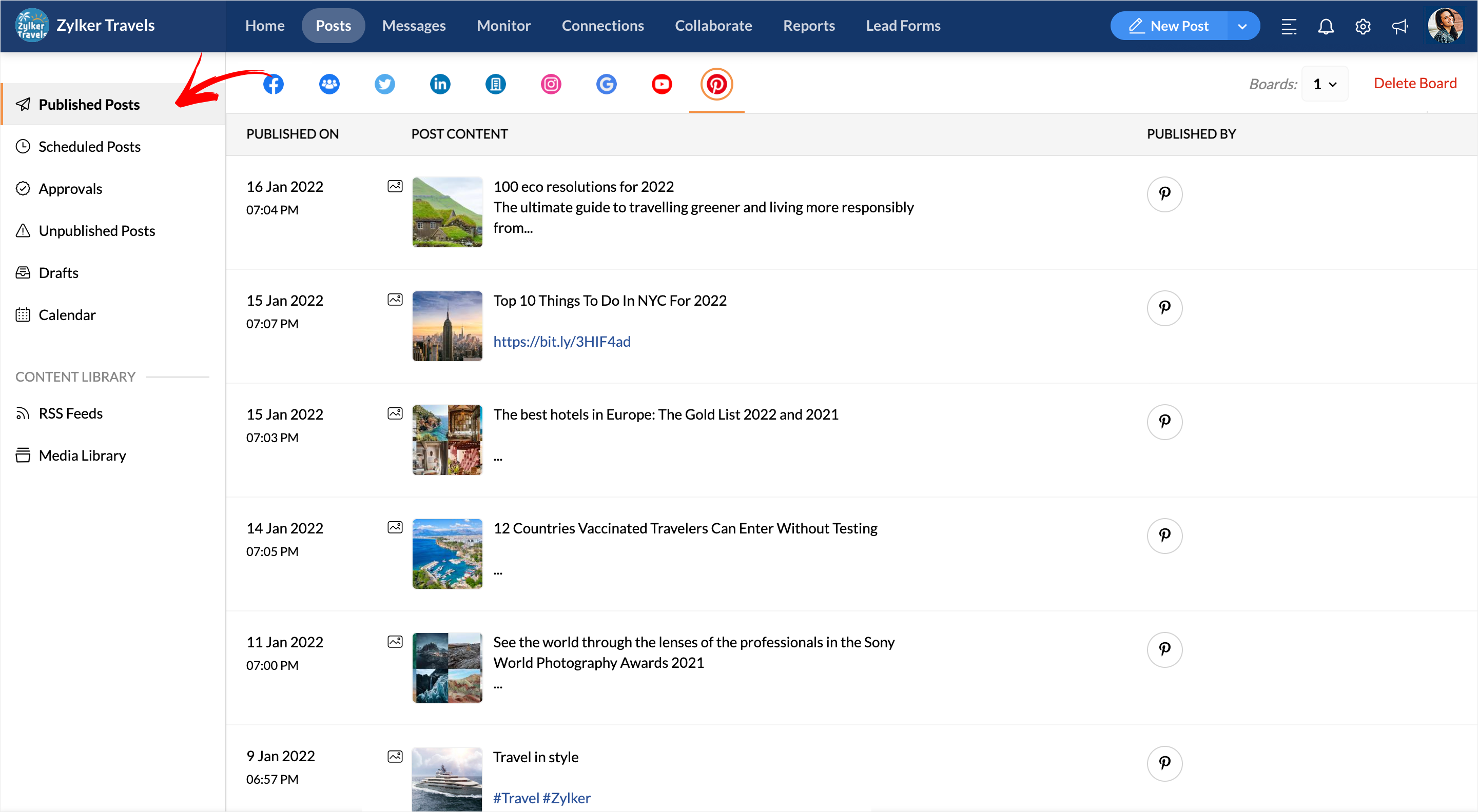 PinterestアカウントとZoho Socialを連携すると、Zoho Social内から、公開するピンを作成したり、特定の日時に投稿を予約したりできます。複数のピンの投稿をまとめて予約することも可能です。