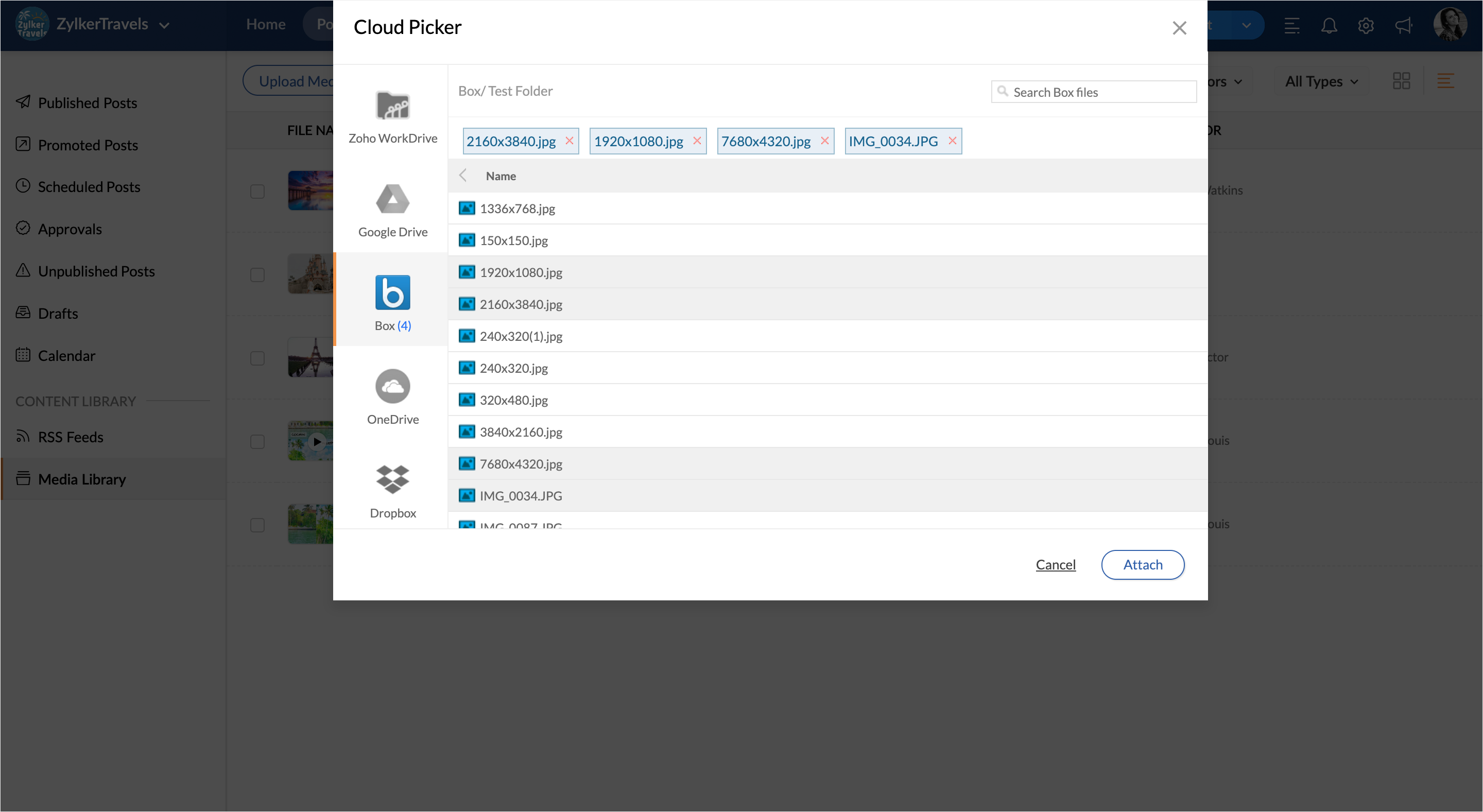 箱から Zoho Social のメディアライブラリにメディアを転送するには、