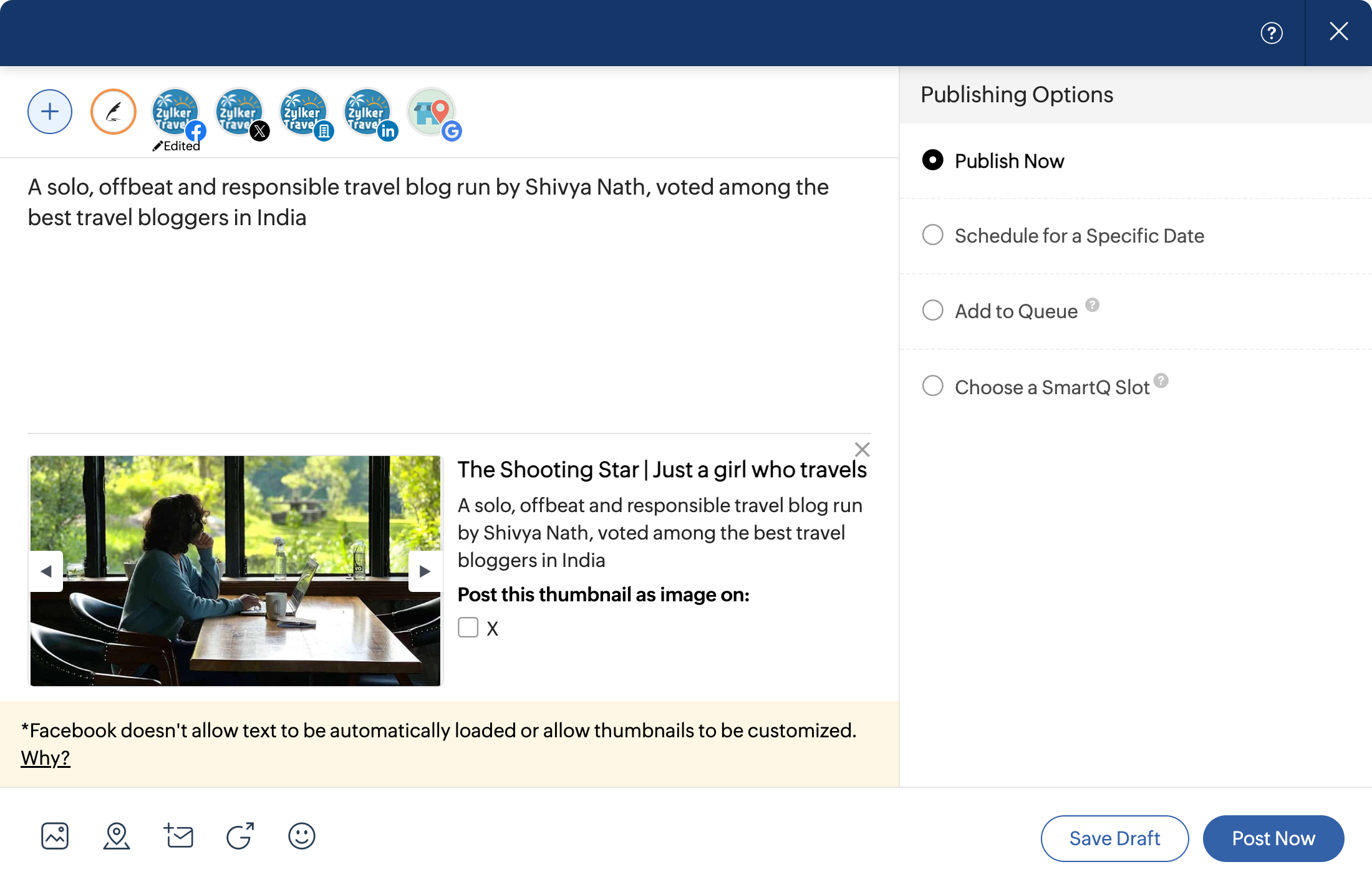 1. zShareを使用してFacebookフィードにリンクを配布すると、フィードからzShare作成ウィンドウに自動的に画像が差出人されます。ただし、Facebookでは、共有する投稿のコンテンツを手動で種類する必要があります。これは、FacebookがZoho Socialのようなサードパーティのアプリケーションからのコンテンツの自動差出人を制限しているからです。したがって、Facebookページで共有するためのコピーを種類する必要があります。