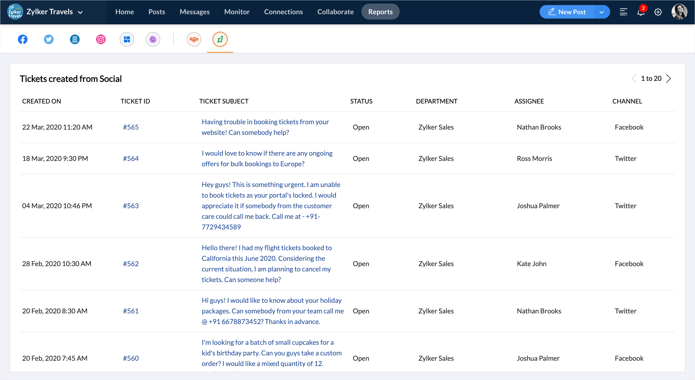 2. Zoho Socialから作成されたすべての問い合わせが表示されます。
