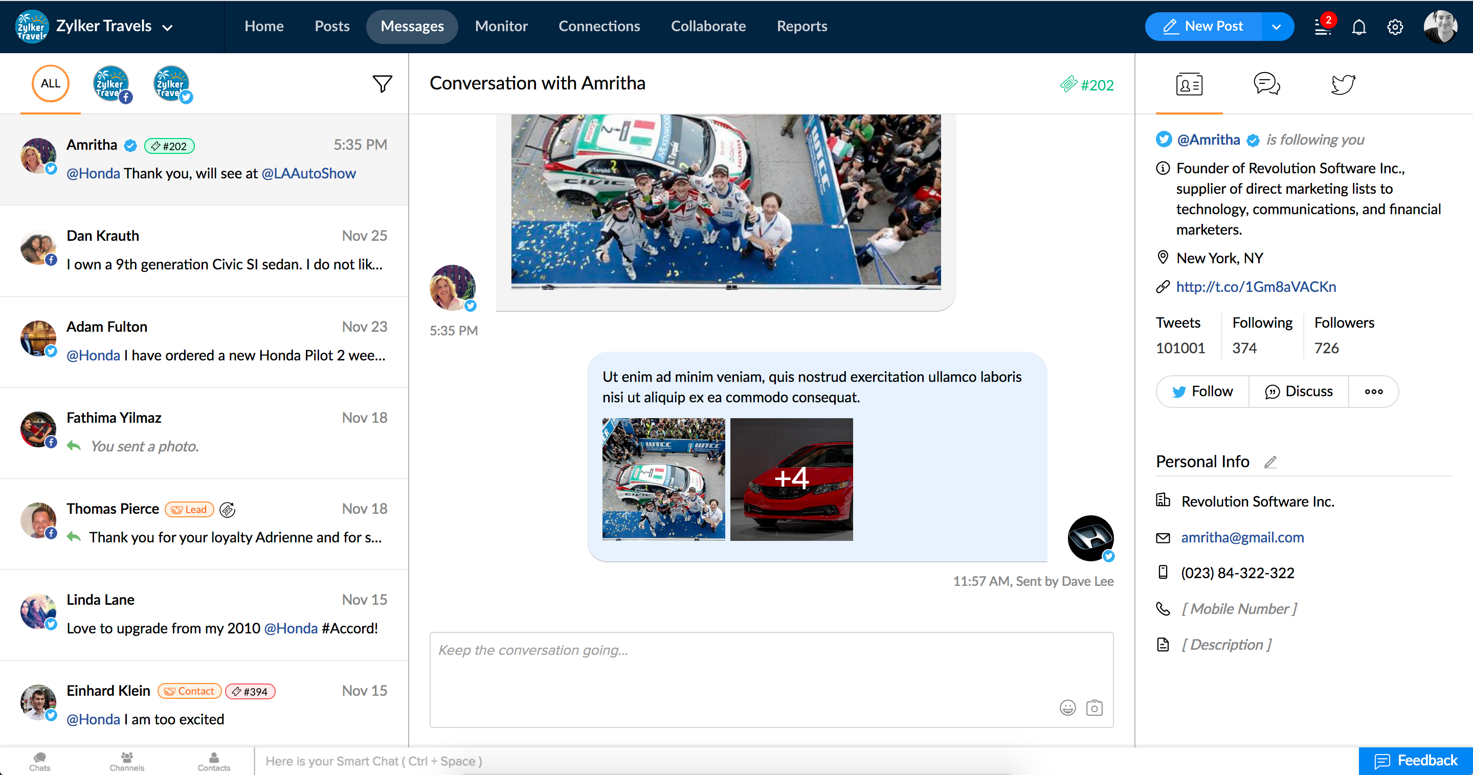 Zoho Socialの[メッセージ]タブでは、フォロワーやファンから受け取った非公開のメッセージに対してリアルタイムで返信することができます。また、他のチームメンバーと過去に行ったやりとりなど、対象のフォロワーやファンに関するさまざまな情報を確認することができます。