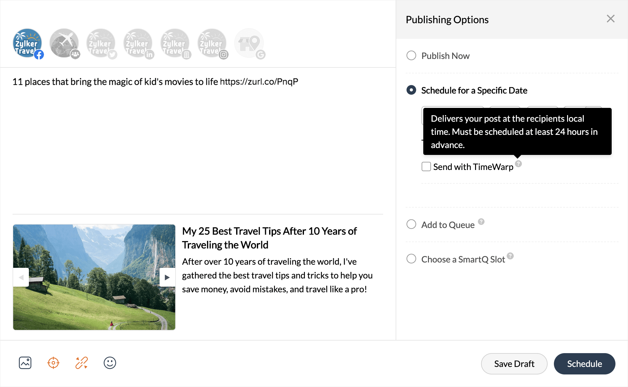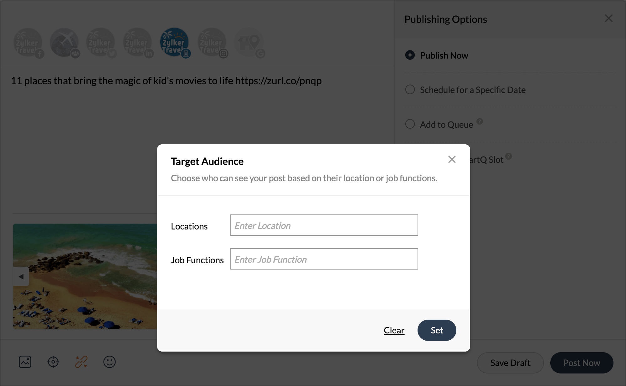 対象を設定することができるのは、Facebookページ、LinkedInの会社ページで投稿する場合のみです。LinkedInの場合、300人以上のフォロワーを対象とする必要があります。