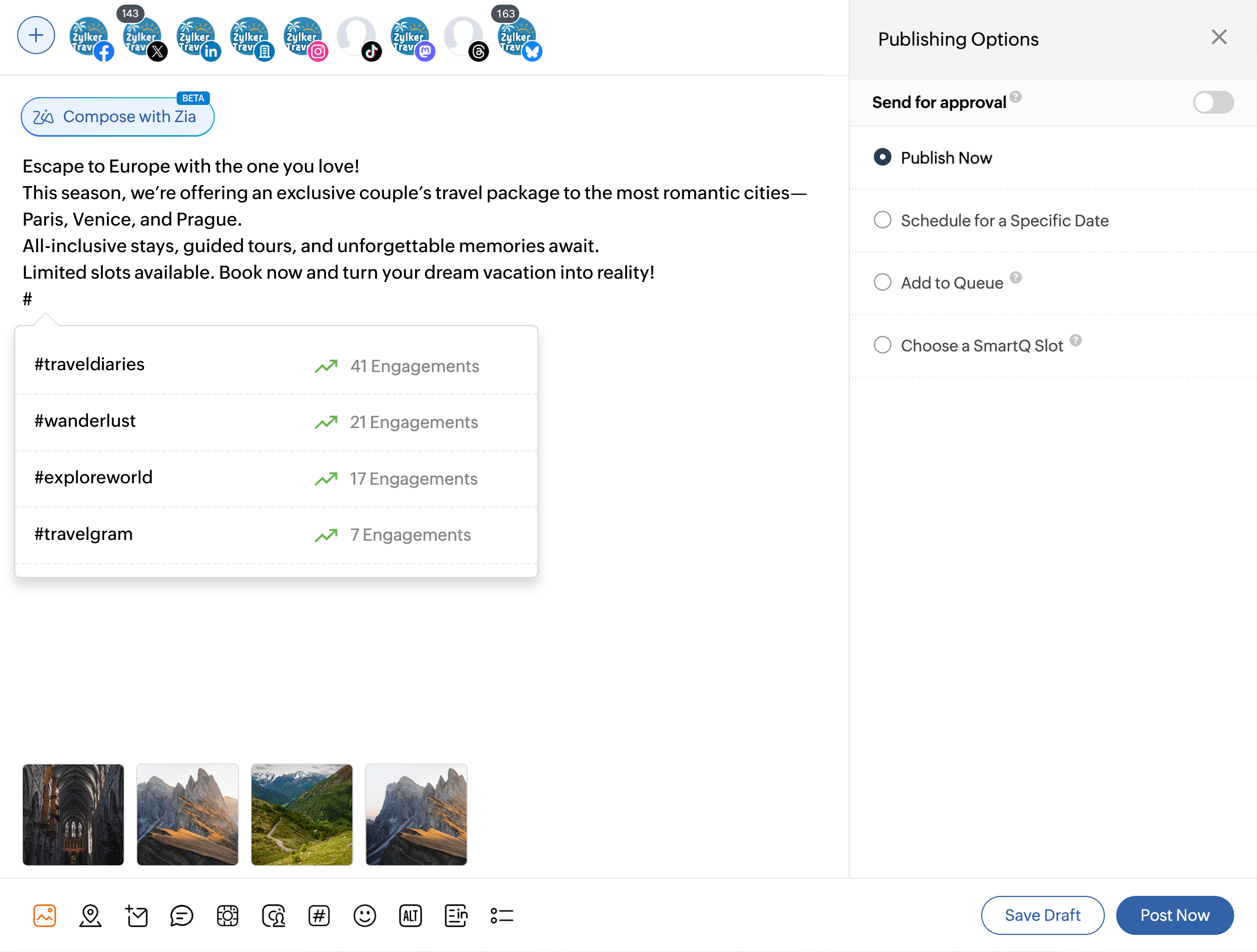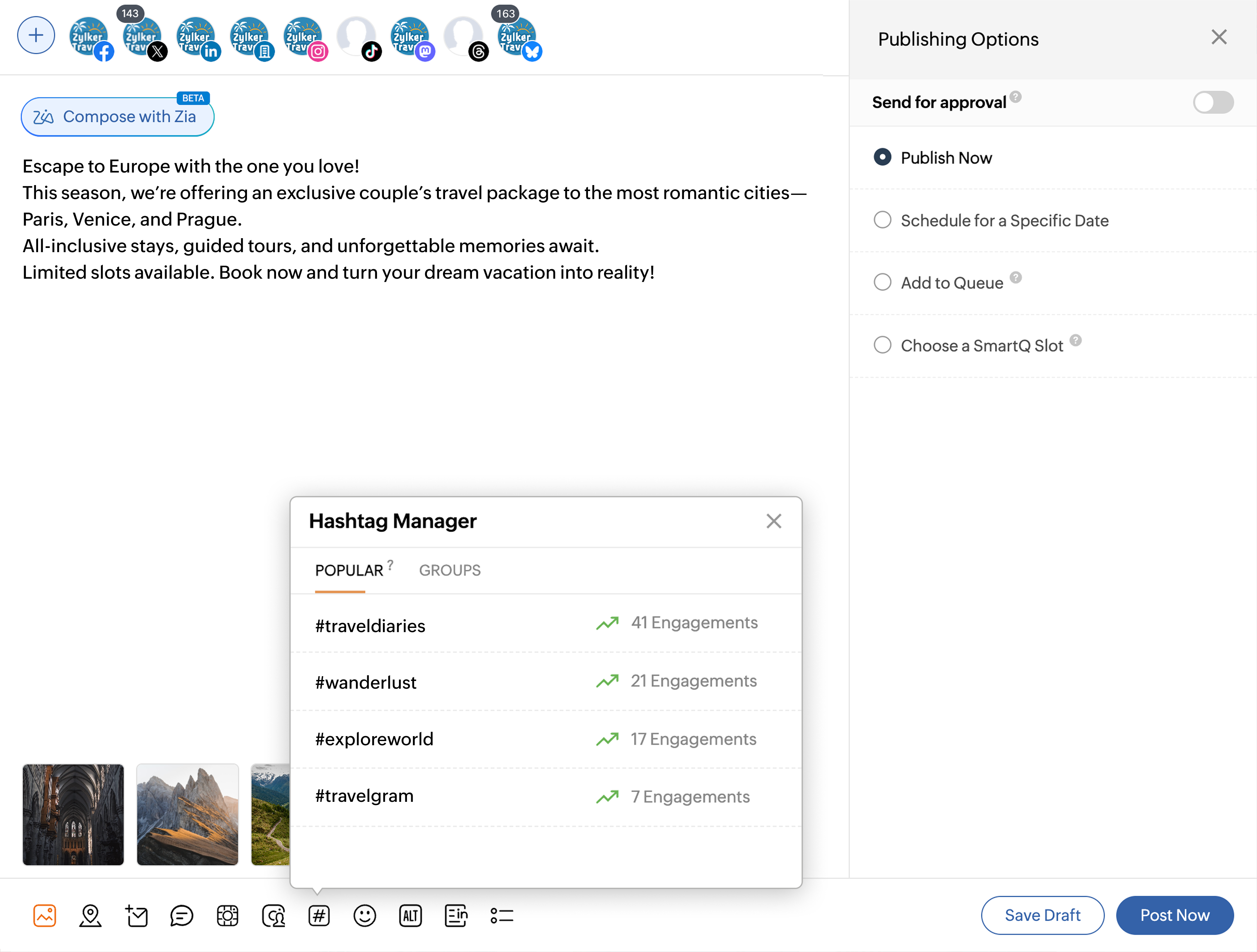 たとえば、ヨーロッパ旅行に行くカップル向けの特別オファーについて、旅行代理店として投稿を作成している場合、この機能は過去の投稿の中で最もエンゲージメントの高かったハッシュタグを自動的に表示します。おすすめは選択したチャネルからのみ取得されるため、最も重要なチャネルで成果を出すことに特化したハッシュタグ提案を信頼して活用できます。
