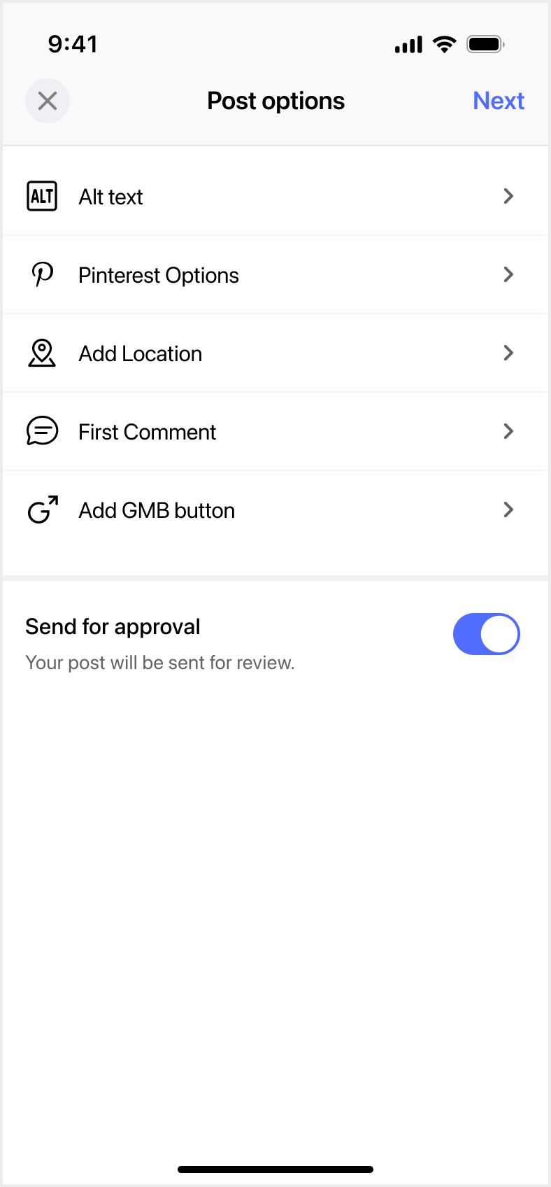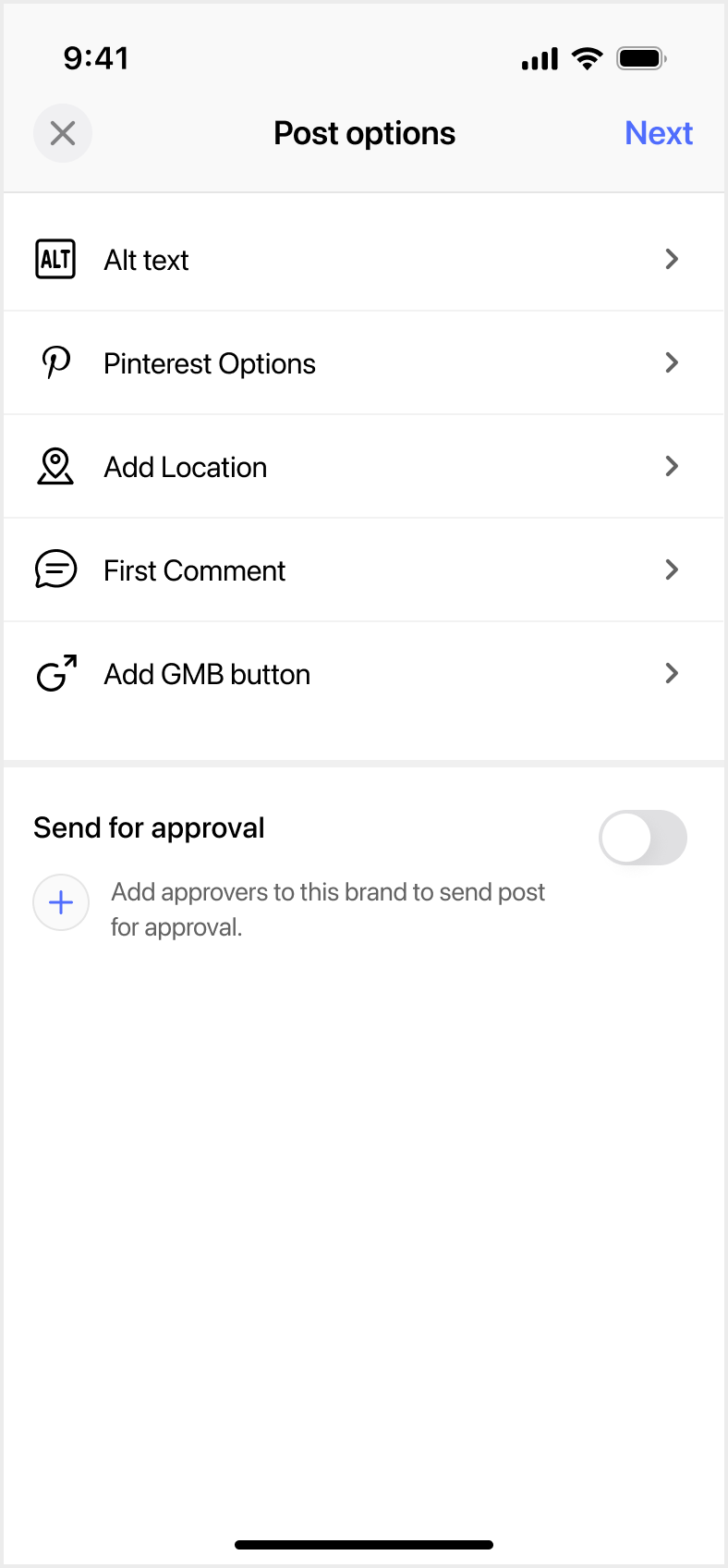 5. ブランド内のすべての承認者に承認用の投稿を送信するには、[承認用に送信する]の横にある切り替えボタンをタップします。