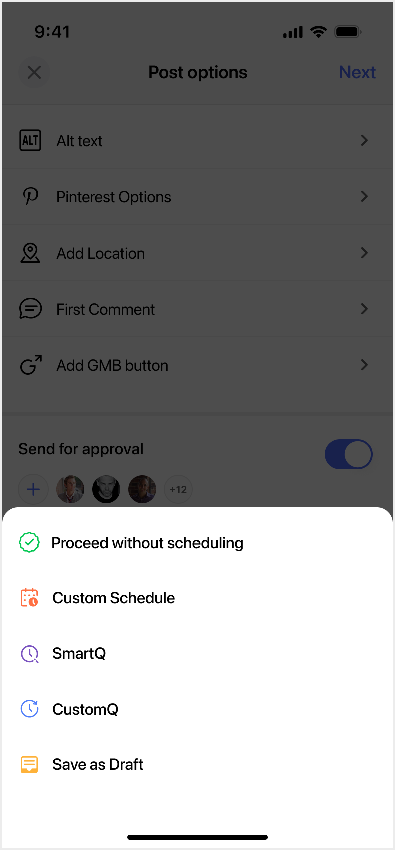7. [予約せずに続ける]を選択すると、投稿が承認された後に公開されます。指定した日時に投稿を公開するには、[Custom Schedule](公開日時を予約)、[SmartQ](スマート予測から日時を選択する)[CustomQ](待機枠に追加する)のいずれかの予約方法を選択します。 [下書きとして保存する]をタップして、下書きとして保存することもできます。