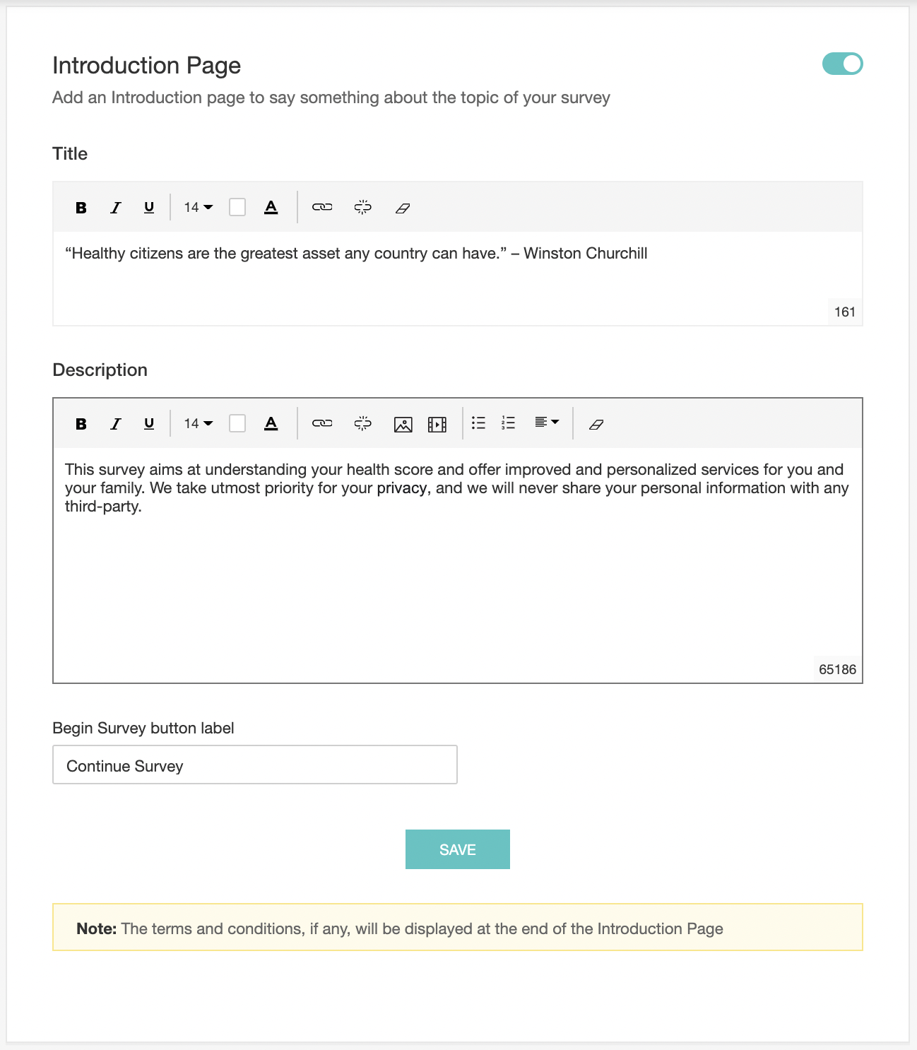 表紙ページを追加して、アンケートの概要や目的について紹介できます。アンケートの回答を始める前に概要や目的を確認した上で回答を進めてもらうようにすることが可能です。この機能は、[設定]タブから有効/無効にできます。設定した表紙ページは、オフライン時のアンケートのホーム画面としても使用されます。また、規約ページを設定した場合は、表紙ページの最下部に規約が表示されます。