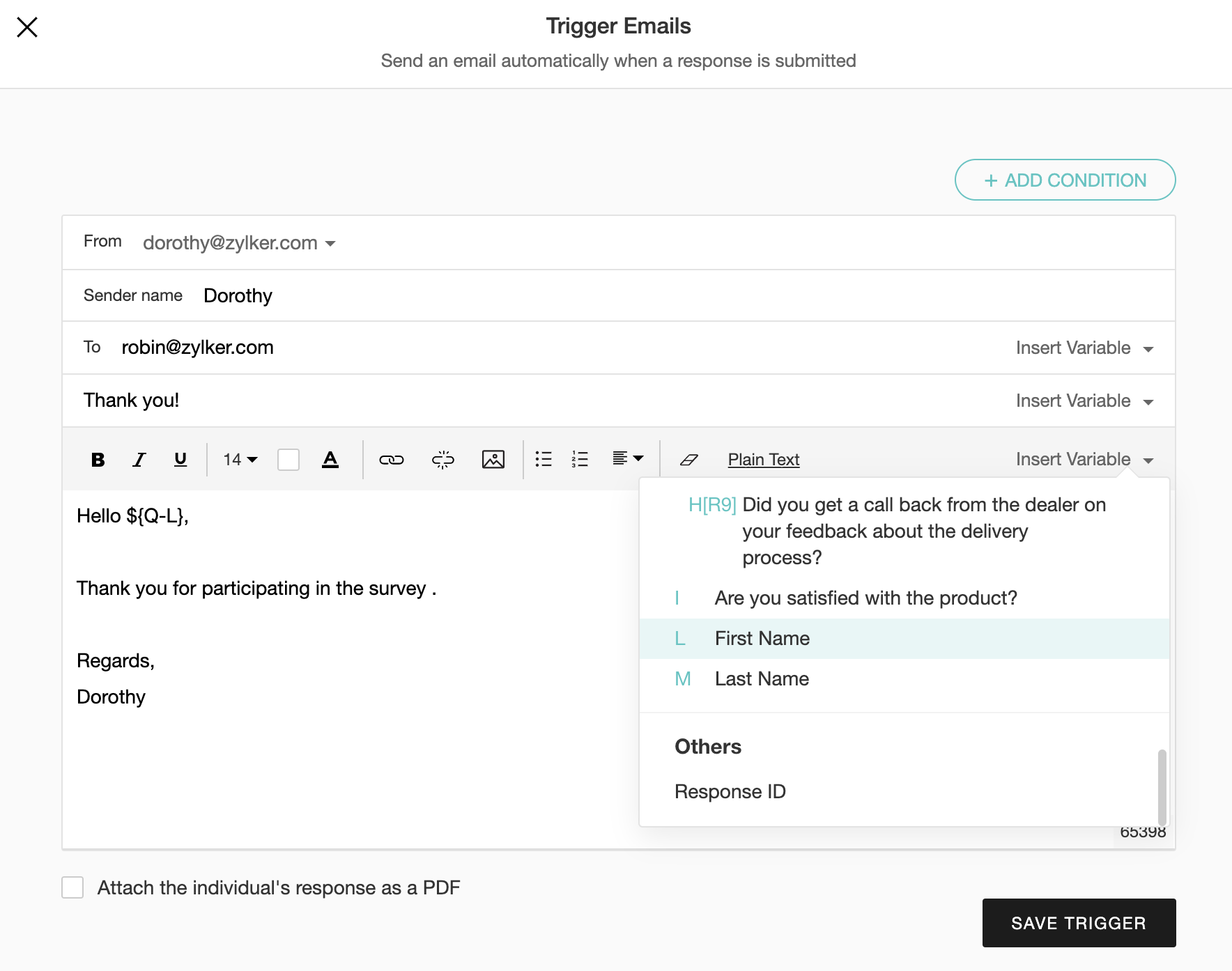 4. [差出人][送信者名][宛先][件名]欄に入力後、メールの本文を入力します。[変数を挿入する]一覧から変数を選択して、内容をカスタマイズすることもできます。たとえば、[名前]という変数を挿入して、「<回答者名>さんへのお知らせです」というように使用します。