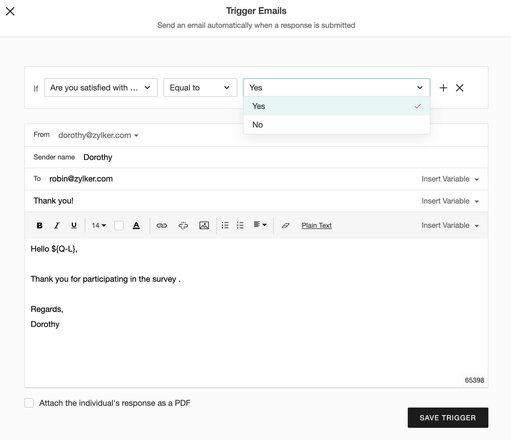 10. メールの本文を入力します。変数を挿入することもできます。[変数を挿入する]一覧で、[すべての回答]を選択すると、回答者が送信したすべての回答がメールに挿入されます。また、変数の挿入機能を使用して、各質問やページの得点の詳細を送信することもできます。
