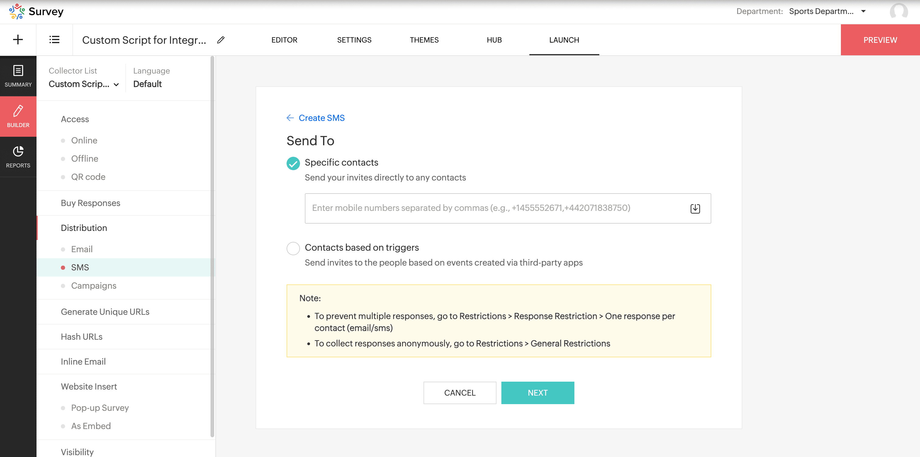 アンケートを配布する連絡先を選択します。連絡先はCSVまたはXLSファイルからアップロードするか、手動で回答者の連絡先詳細を入力できます。
