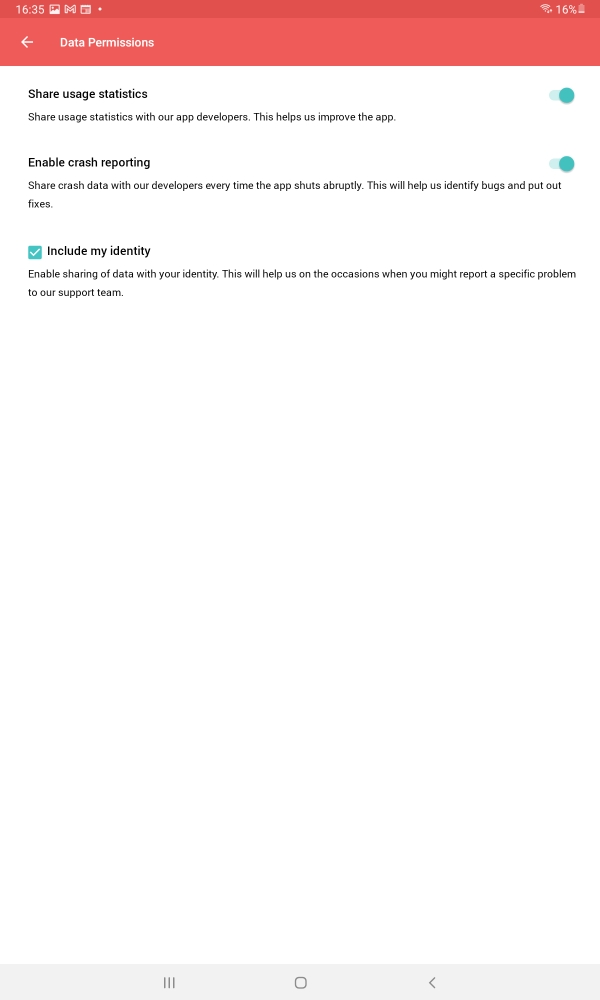 3. 自分の情報を含める:サポート対応などのため、利用統計やクラッシュレポートを送信する際に、アプリで利用しているアカウントのメールアドレスの情報を含めて送信できます。