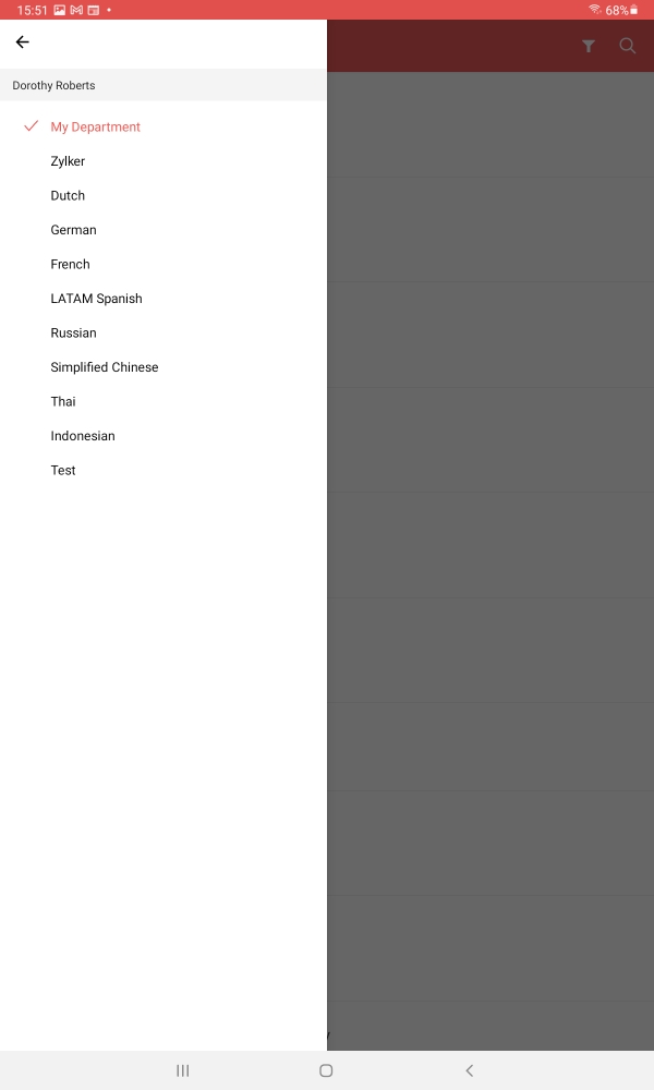 2. 部門名をタップします。自分が所属している部門の一覧が表示されます。部門を選択すると、該当の部門のアンケートの一覧が表示されます。また、該当の部門のアンケート数の合計や、公開中(開始済み)/下書きのアンケートの数もそれぞれ表示されます。