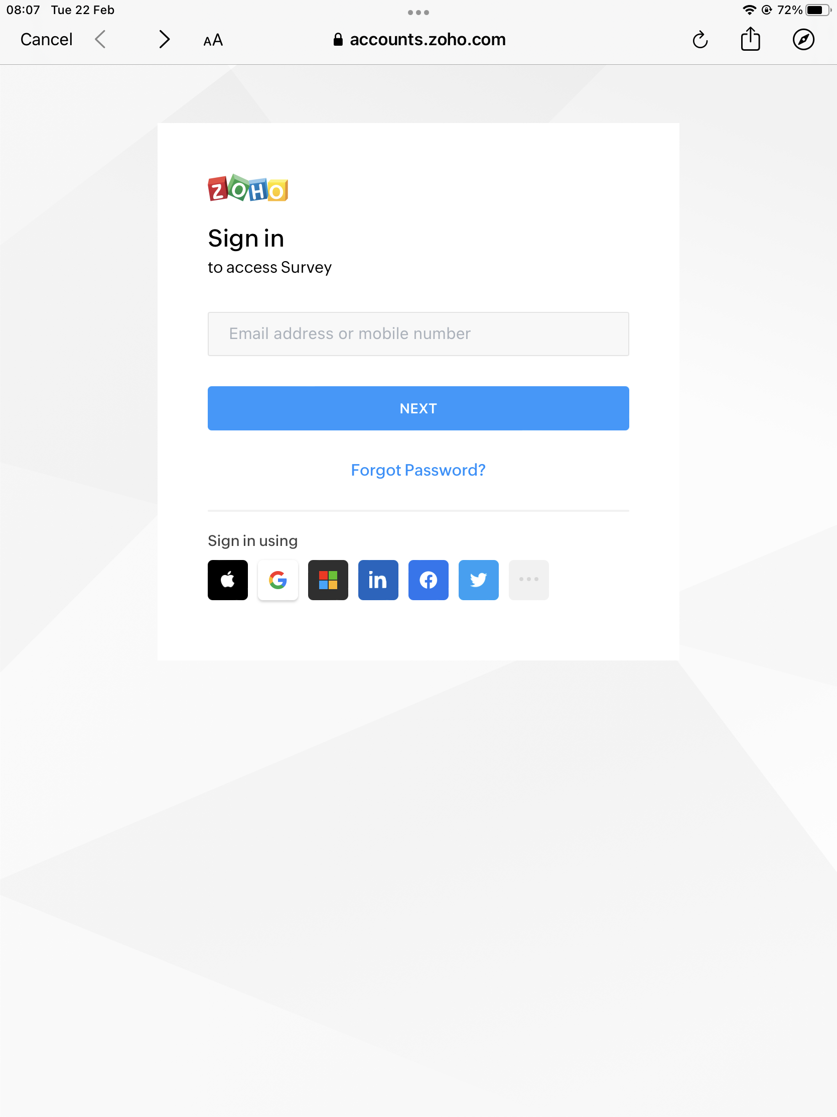 2. Zohoアカウントの認証情報を入力してサインインします。サインイン後、 [自分のアンケート] ページが表示されます。なお、Apple IDを利用してサインインするか、ゲストとしてサインインすることもできます。