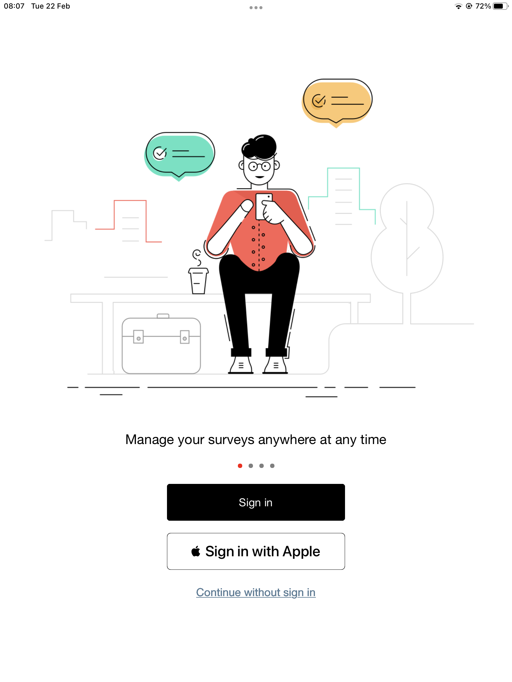 2. [サインインせずに続ける] をタップし、 [開始する] をタップします。なお、オフライン用URLの設定を行った後は、そのURLを通じてアンケートにアクセスできるようになります。