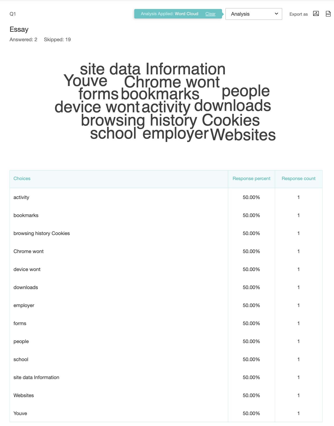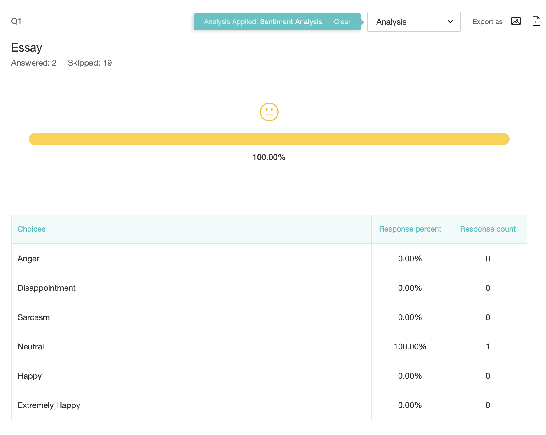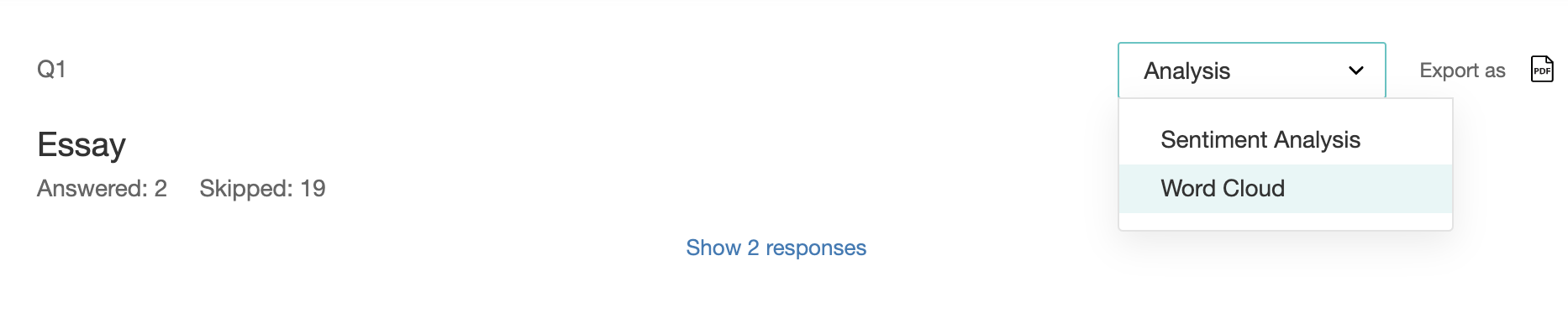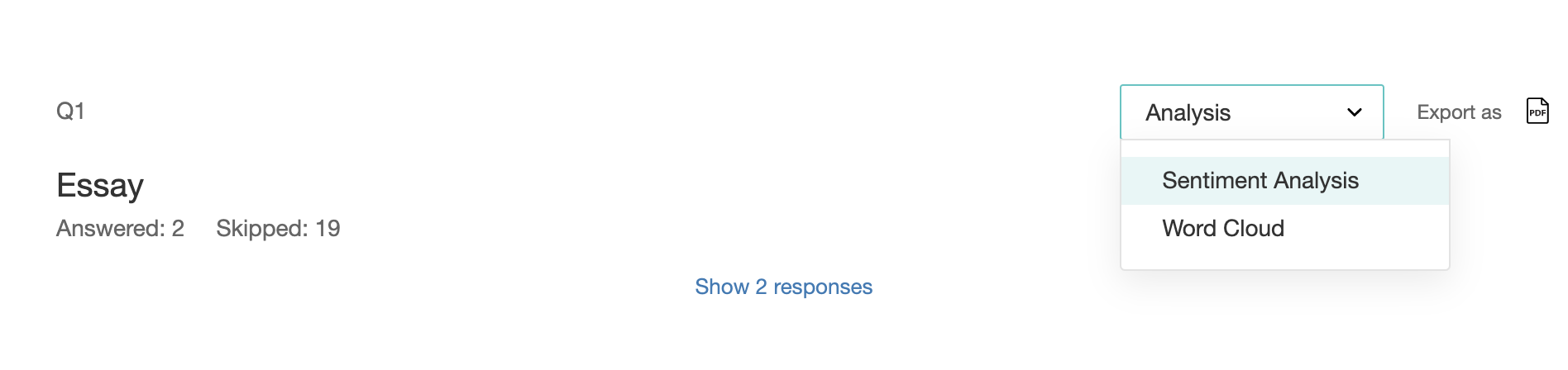 感情分析とワードクラウドの機能を利用すると、回答者の感情情報を把握できます。感情分析機能は、長文回答の質問形式のみ利用できます(現在は回答が英語の場合のみ利用できます)。