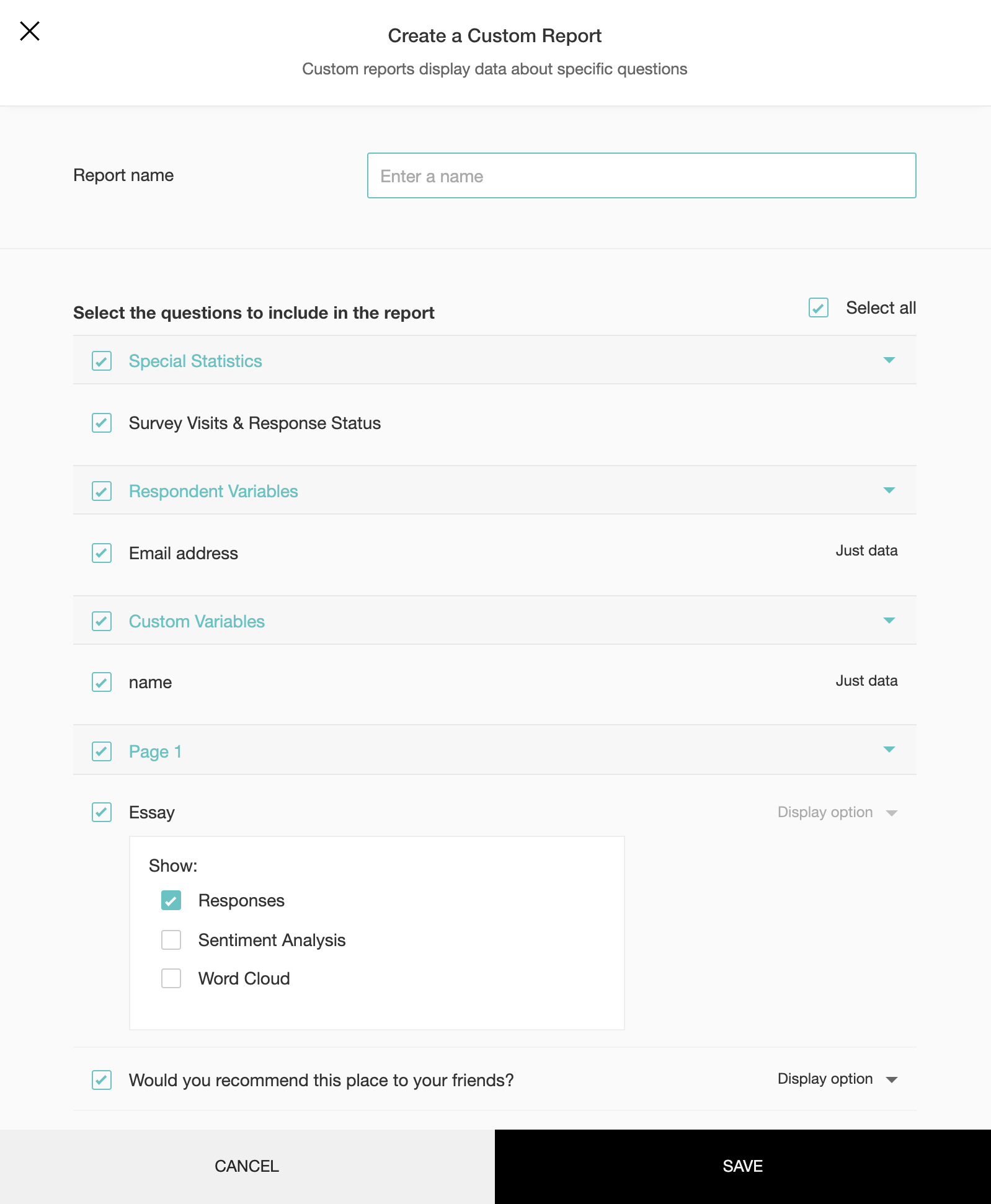 1. すべての質問をレポートに表示するには、[すべて選択する]チェックボックスにチェックを入れます。