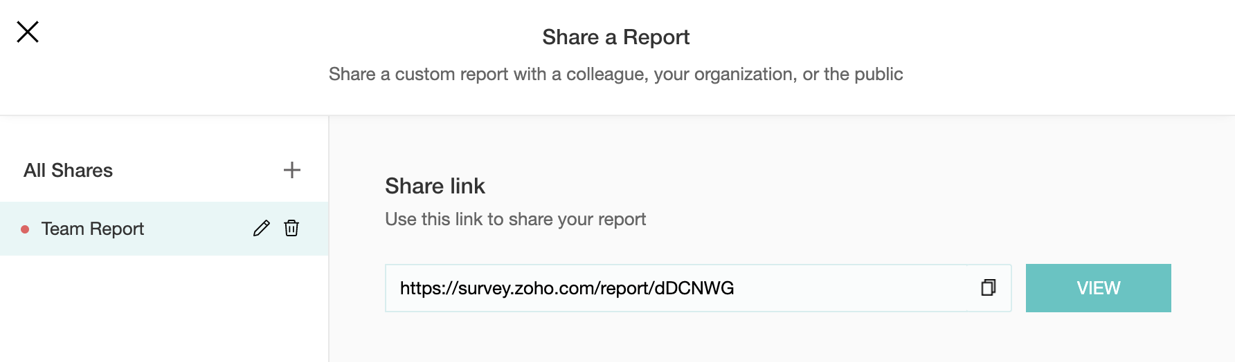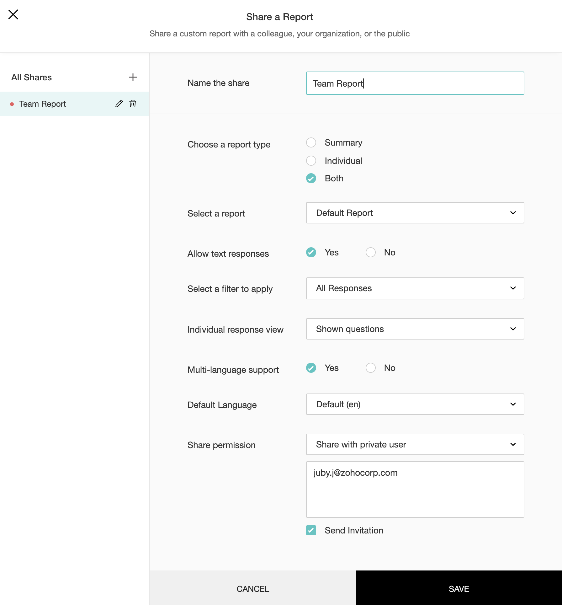 レポートは、同僚、回答者、組織と共有できます。公開することも可能です。また、公開するレポートにパスワードを設定することもできます。