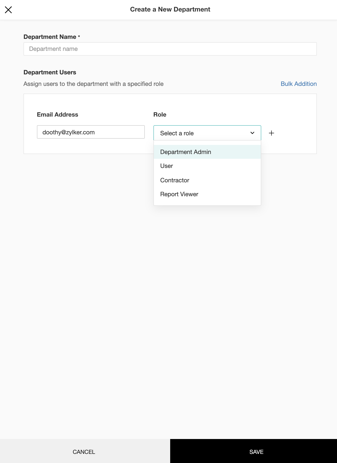 新しい部門を作成できるのは、特権管理者とポータル管理者のみです。それ以外のユーザー(部門管理者を含む)には、新しい部門を追加するためのボタンが表示されません。