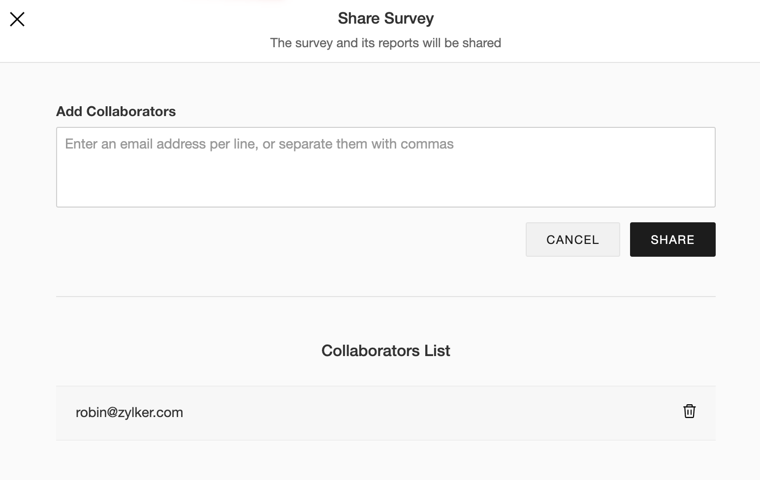 他のユーザーにアンケートを共有し、共同でアンケートを編集することができます。共有されたユーザーは、アンケートの編集、アンケート公開後のレポートへのアクセスなどが可能です。