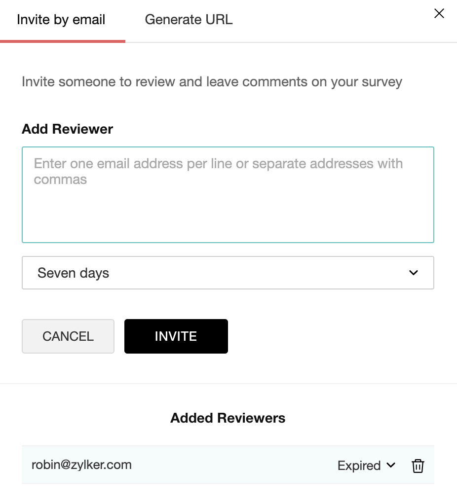 他のメンバーにアンケートへのアクセス権限を許可することで、アンケートをレビューしてコメントを入れてもらうことができます。メンバーの目0ルアドレスを入力するだけで、招待メールが送信されます。レビューの期限を設定します。ただし、プレビューでは回答を収集することはできません。また、プレビューにはアンケート完了ページの条件処理は表示されません。