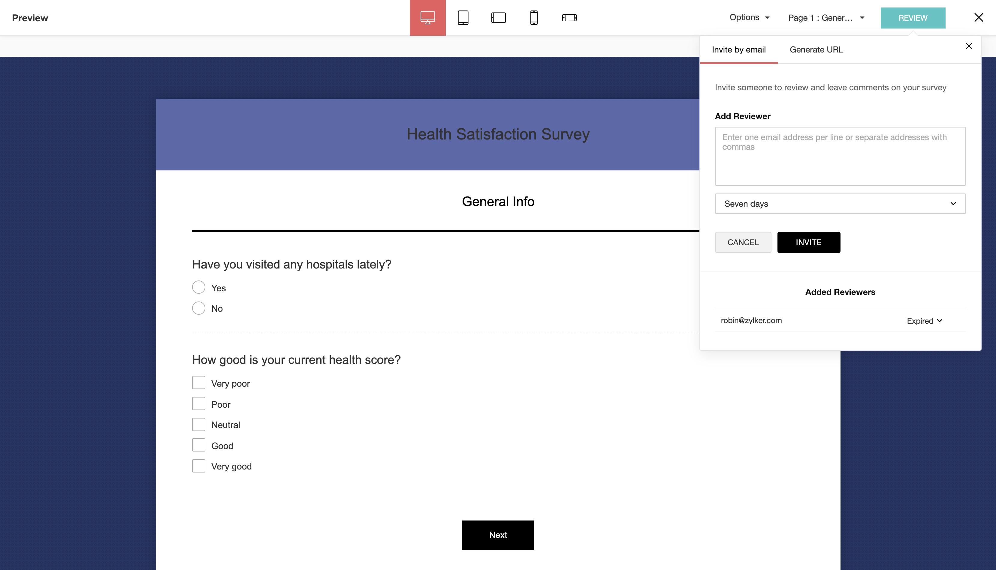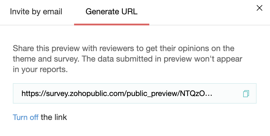 4. 作成したアンケートのプレビューを他のユーザーと共有するには、 [レビュー] 画面にある [URLを生成する] タブをクリックします。