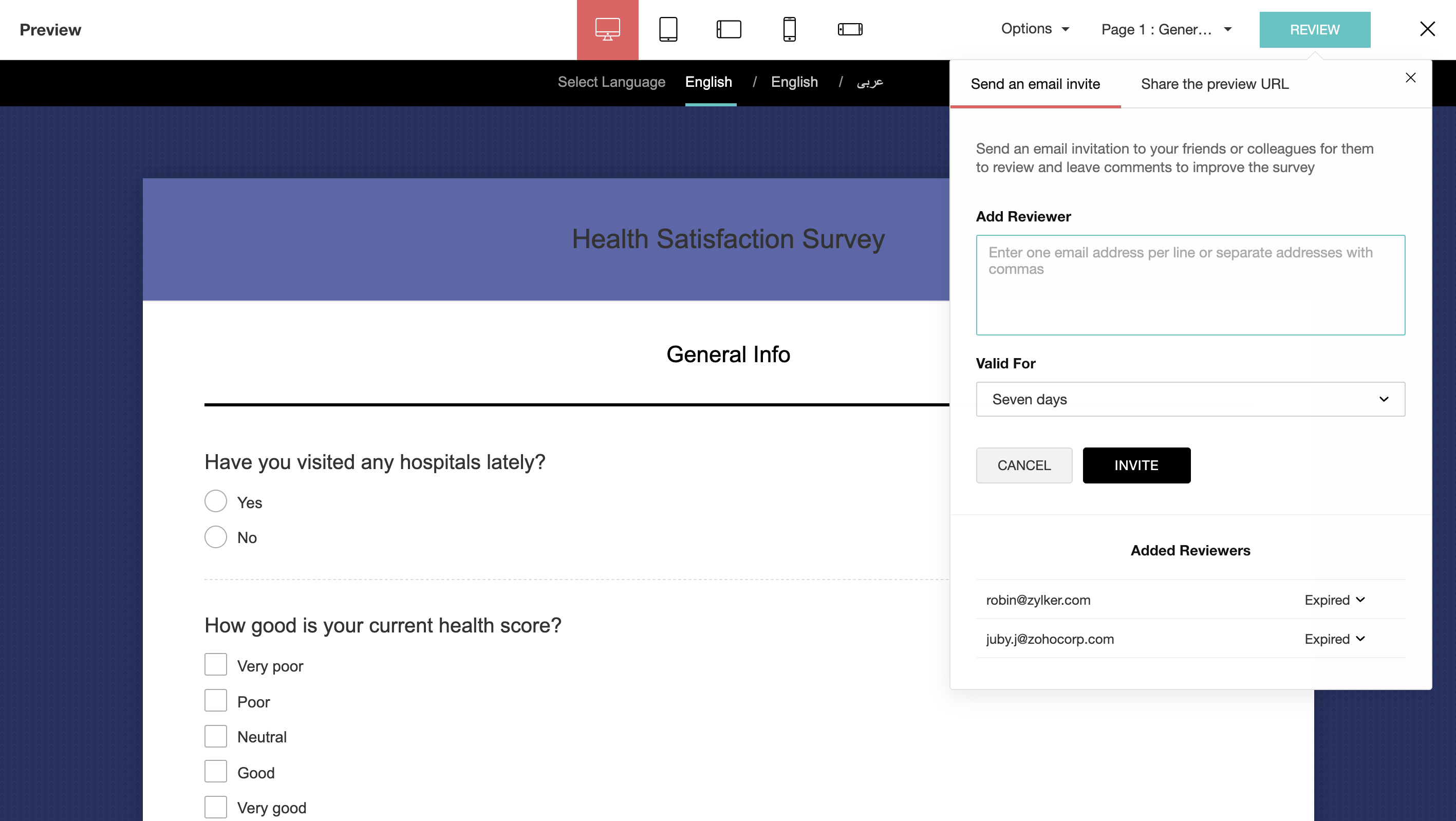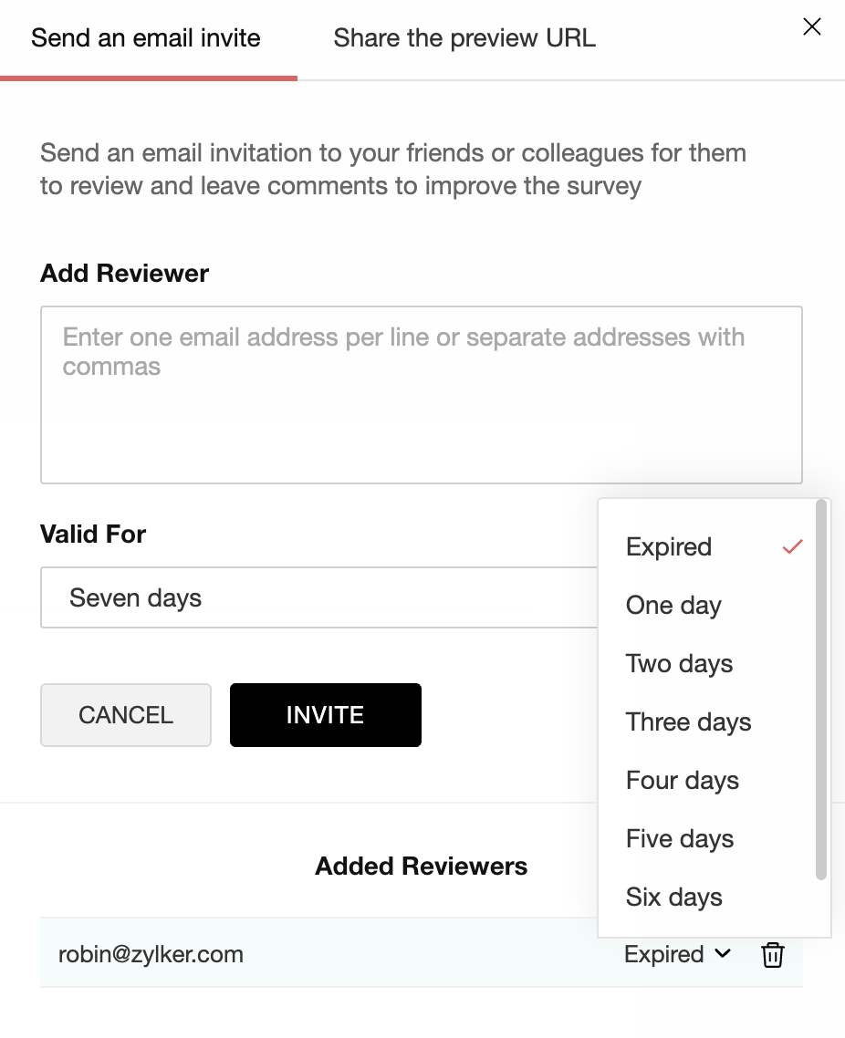 1. メールで招待する - 何人でもレビュアーを招待することができます。また、レビュアーがアンケートにアクセスできる日数を設定できます。レビュアーは、受信トレイに届いたリンクをクリックすると、アンケートにアクセスしてレビューできます。レビュアーはZohoのアカウントがなくてもアンケートにアクセスできます。
