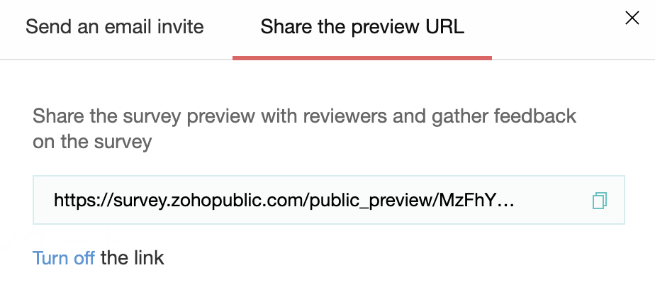1. アンケートのプレビューをレビュアーをと共有するには、[リンクを生成する]リンクをクリックします。プレビューで送信されたデータはレポートに表示されません。