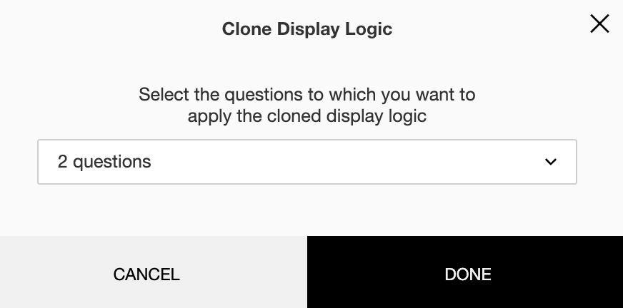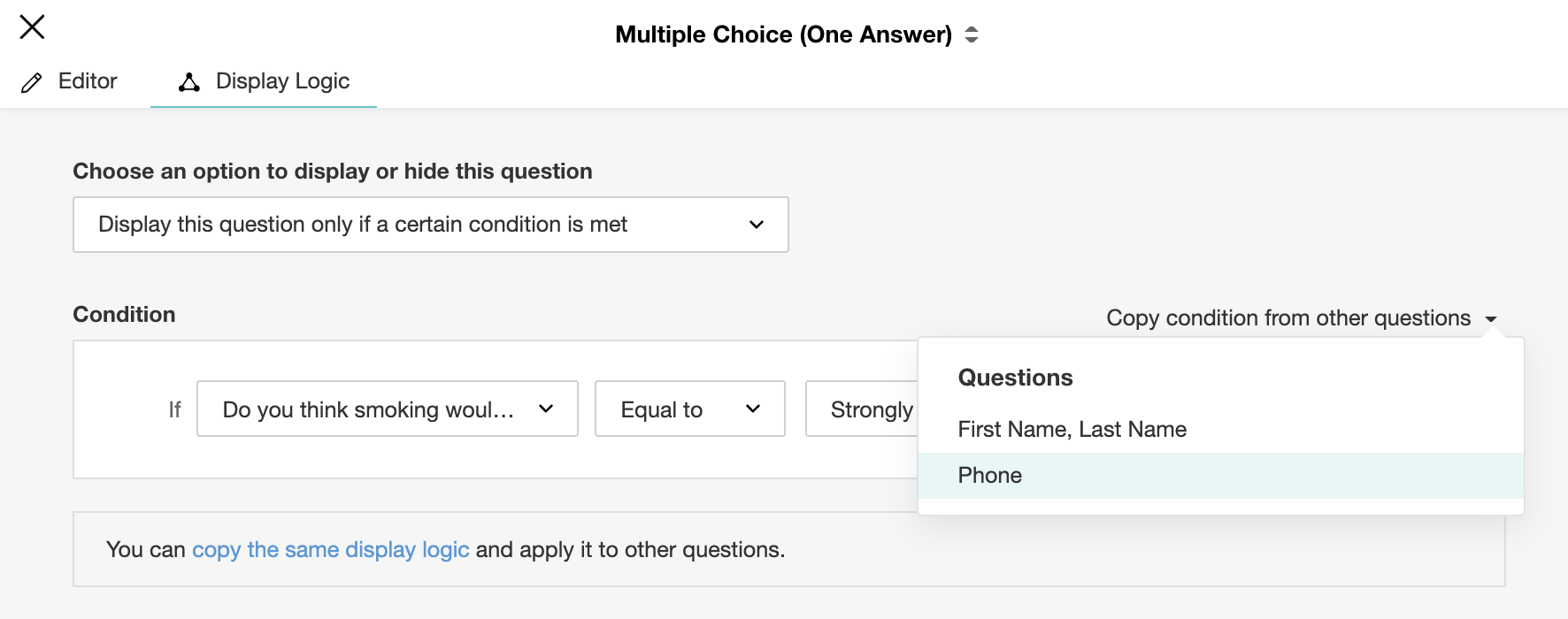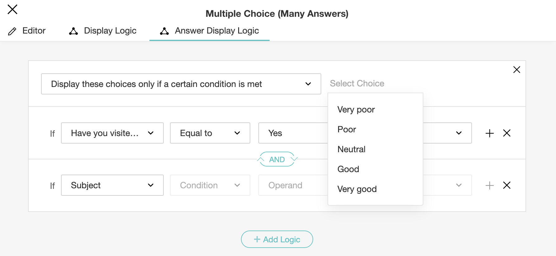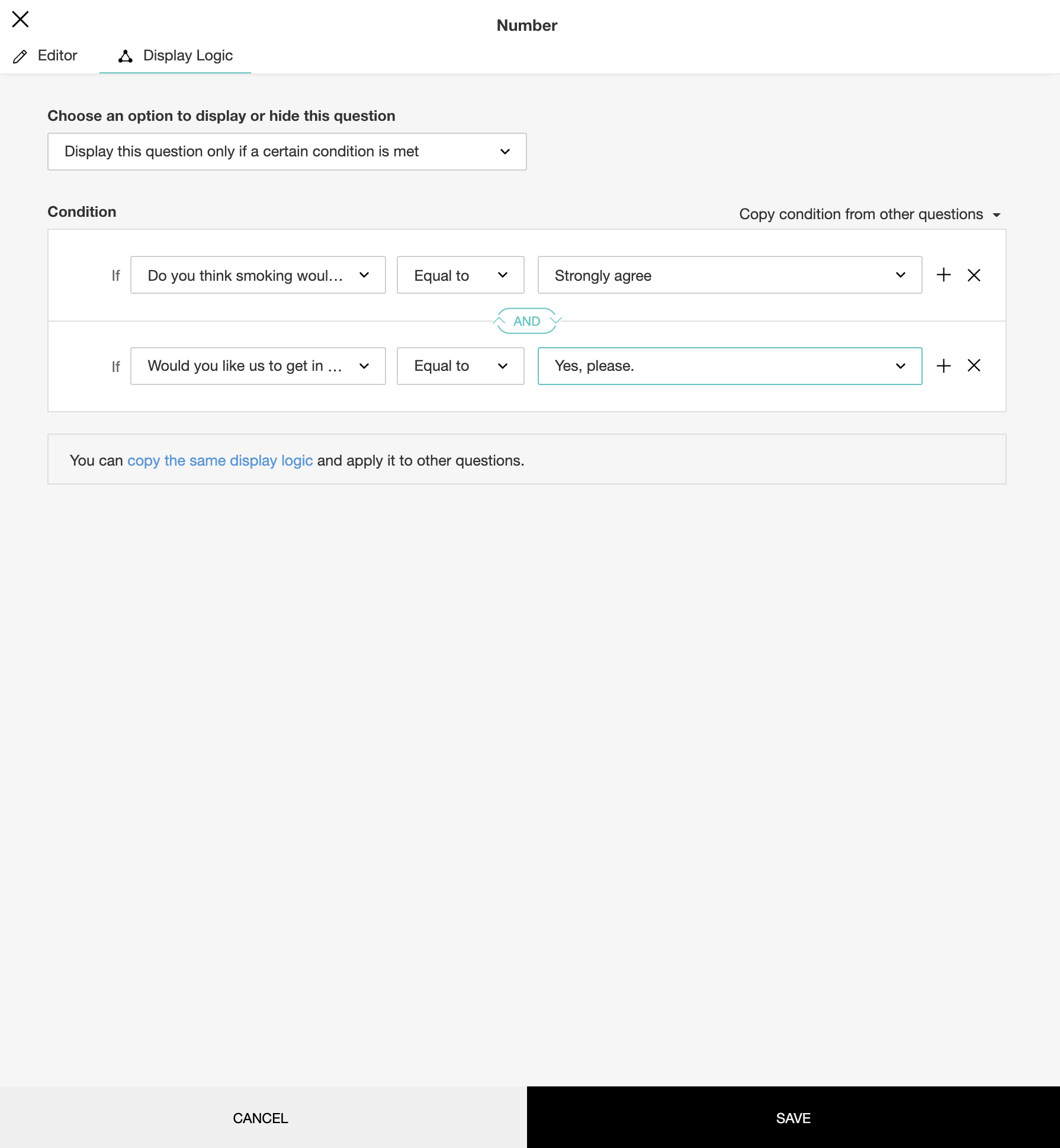 表示条件では、1つの質問に対して、 「かつ」/「または」 の設定を使用して、複数の条件を設定できます。条件をコピーして、同じアンケートの別の質問に適用することもできます。