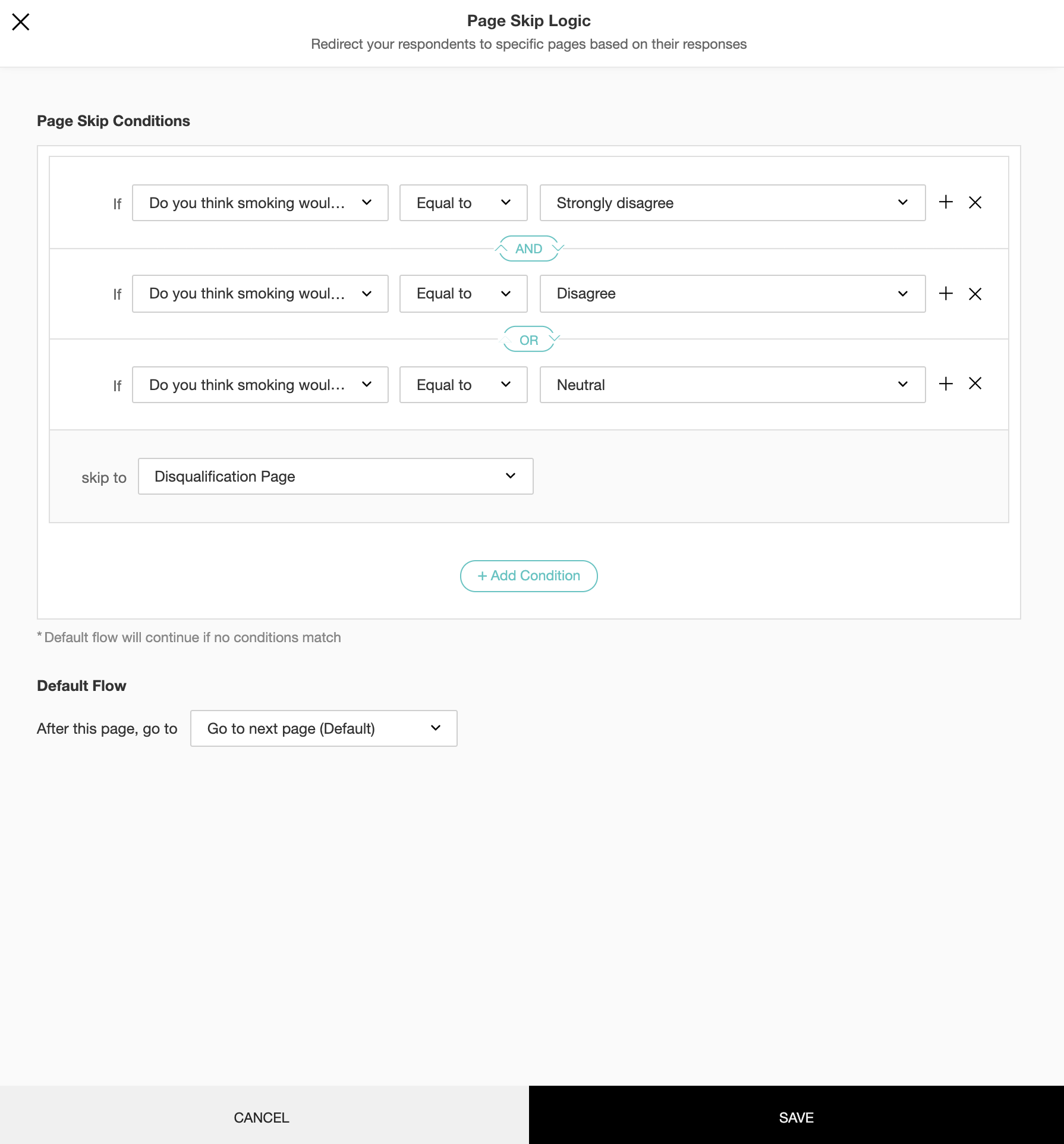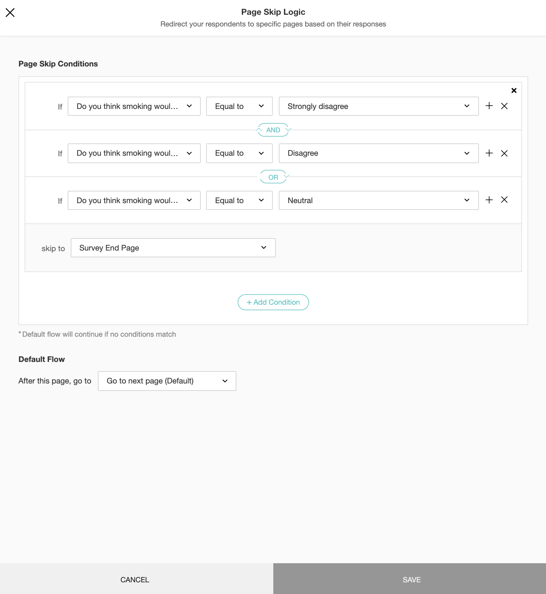ページのスキップ条件を設定すると、回答内容に基づいてアンケートの特定のページに移動するよう設定できます。アンケートにおいて、前のページの質問を使用してページの移動処理を設定したり、「かつ/または」などの条件を使用してより詳細な条件を設定することもできます。
