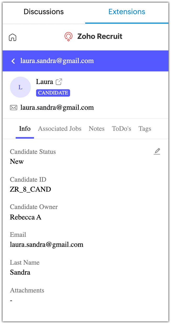 Zoho Recruitは、採用プロセスを効率化するための高機能な応募者管理システムです。この拡張機能を使うと、メールや添付された履歴書を閲覧しながら、候補者を直接Zoho Recruitに追加できます。