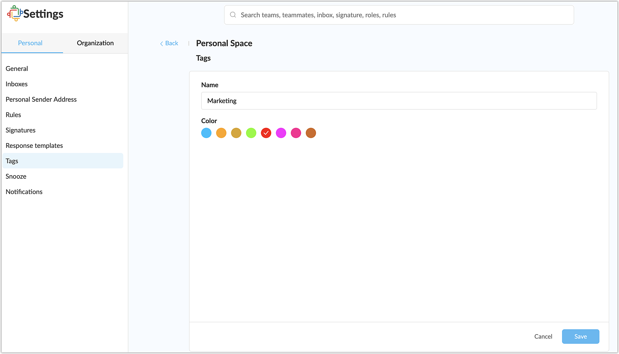 個人スペースで作成したタグは自分のみ閲覧可能で、チームメイトにはアクセス権がありません。