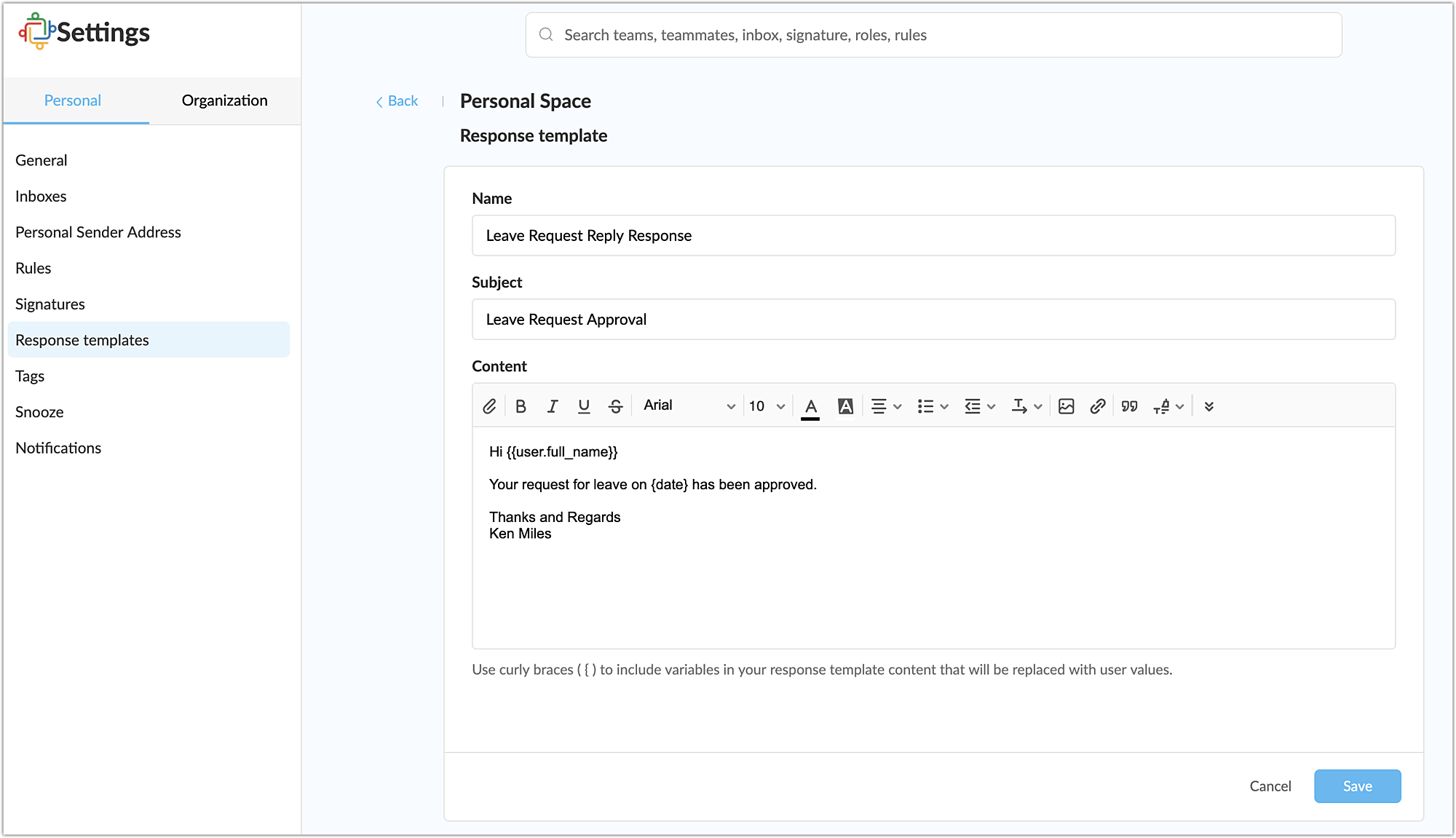 定型文返信(Canned Responses)を利用することで、同じ内容を繰り返し記載する手間を省き、時間を節約できます。Responseテンプレートを使ってメールテンプレートを事前に作成・保存し、メール内容の一貫性を保てます。