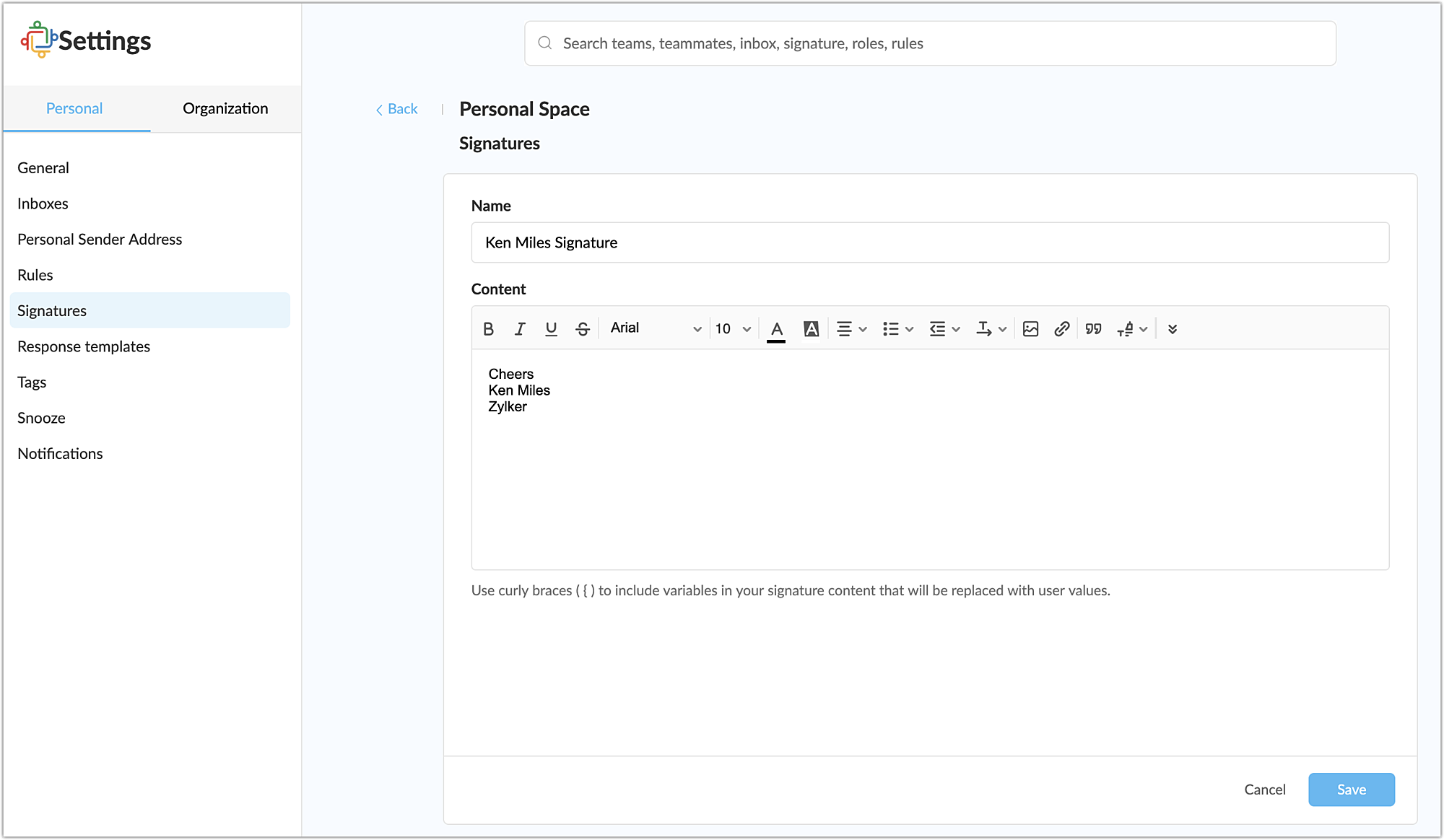 個人受信トレイ用に署名テンプレートを作成し、メール作成時に適切な署名を選択して送信できます。