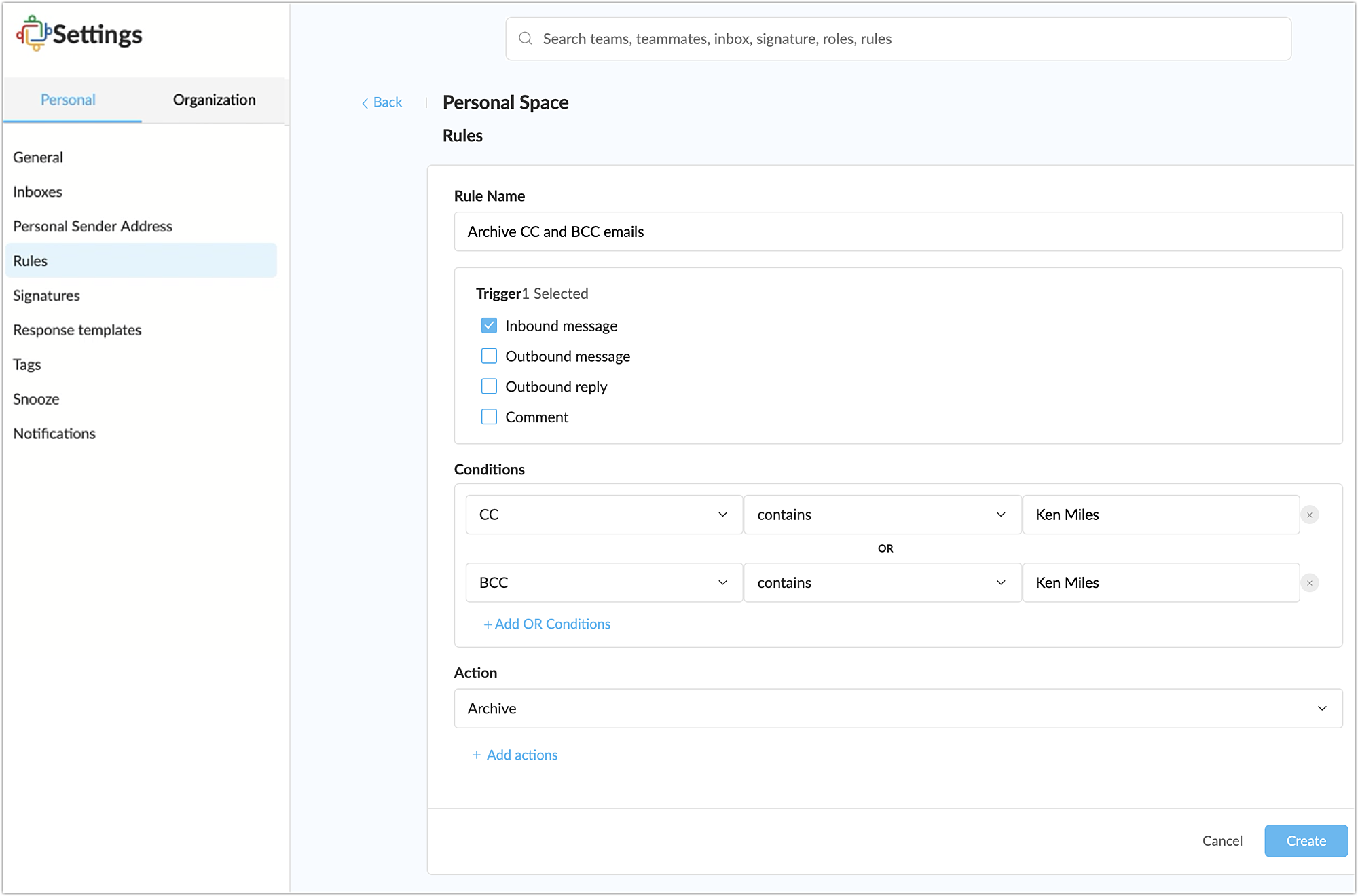 ルールをより理解するために、シナリオを想定しましょう。たとえば、CCまたはBCCで自分が含まれている受信メールをアーカイブしたい場合、以下のようなルールになります。