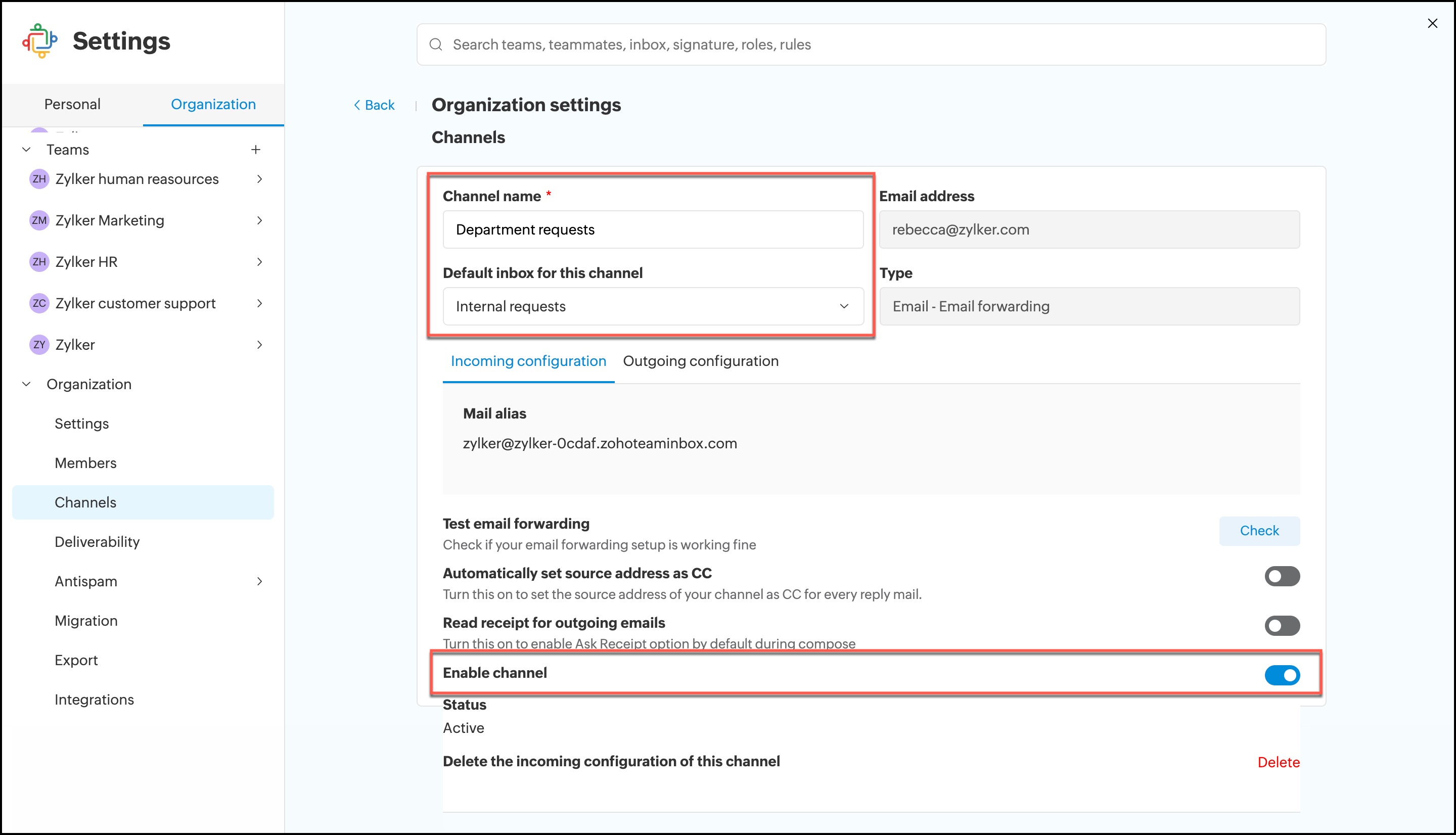 はい、チャネル名の変更、選択済み受信トレイの切り替え、または組織チャネル設定セクション内の既存チャネルの無効化が可能です。