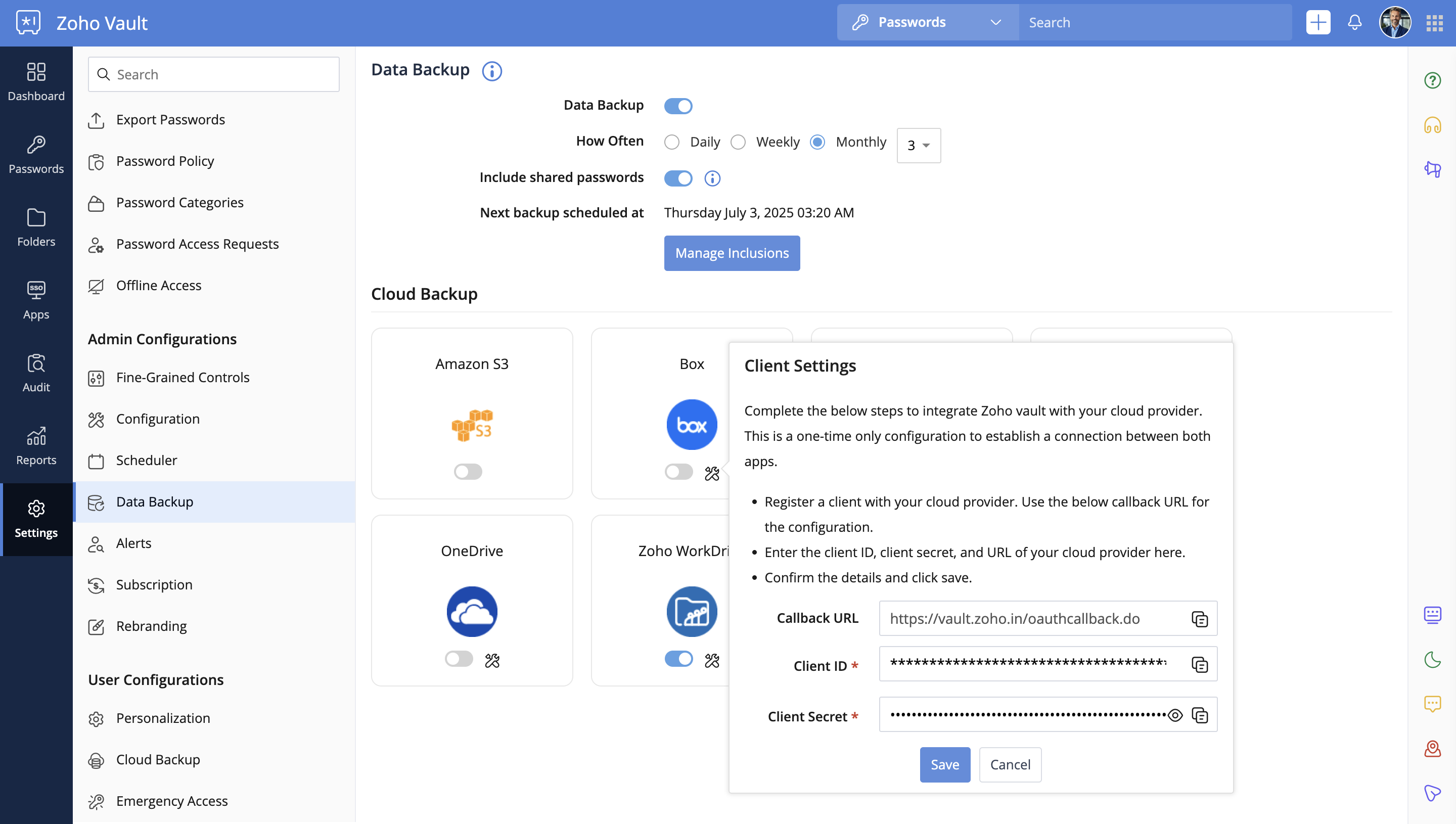 信頼性の高いバックアップ機構は、緊急時にデータを復元するために不可欠です。Zoho Vaultを利用すると、暗号化されたHTMLファイルを定期的にメールやAmazon S3、箱、Dropbox、Google Drive、OneDrive、Zoho WorkDriveなどの標準クラウドストレージサービスに送信し、安全にデータをバックアップできます。