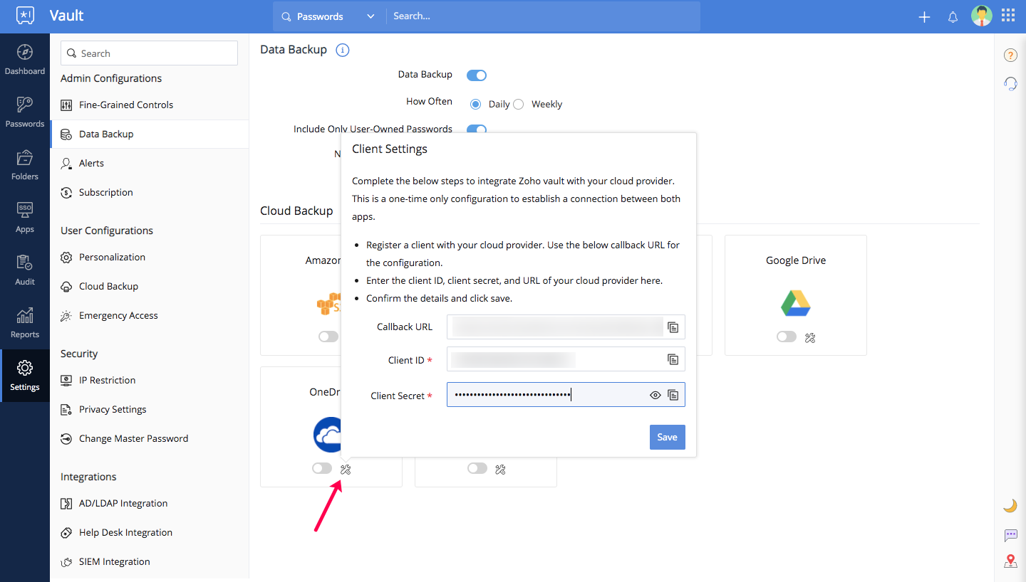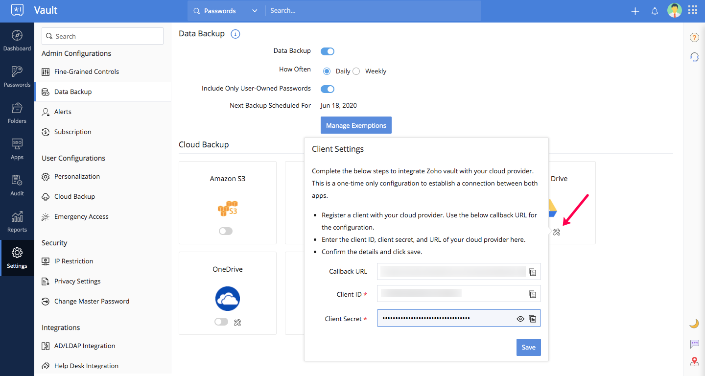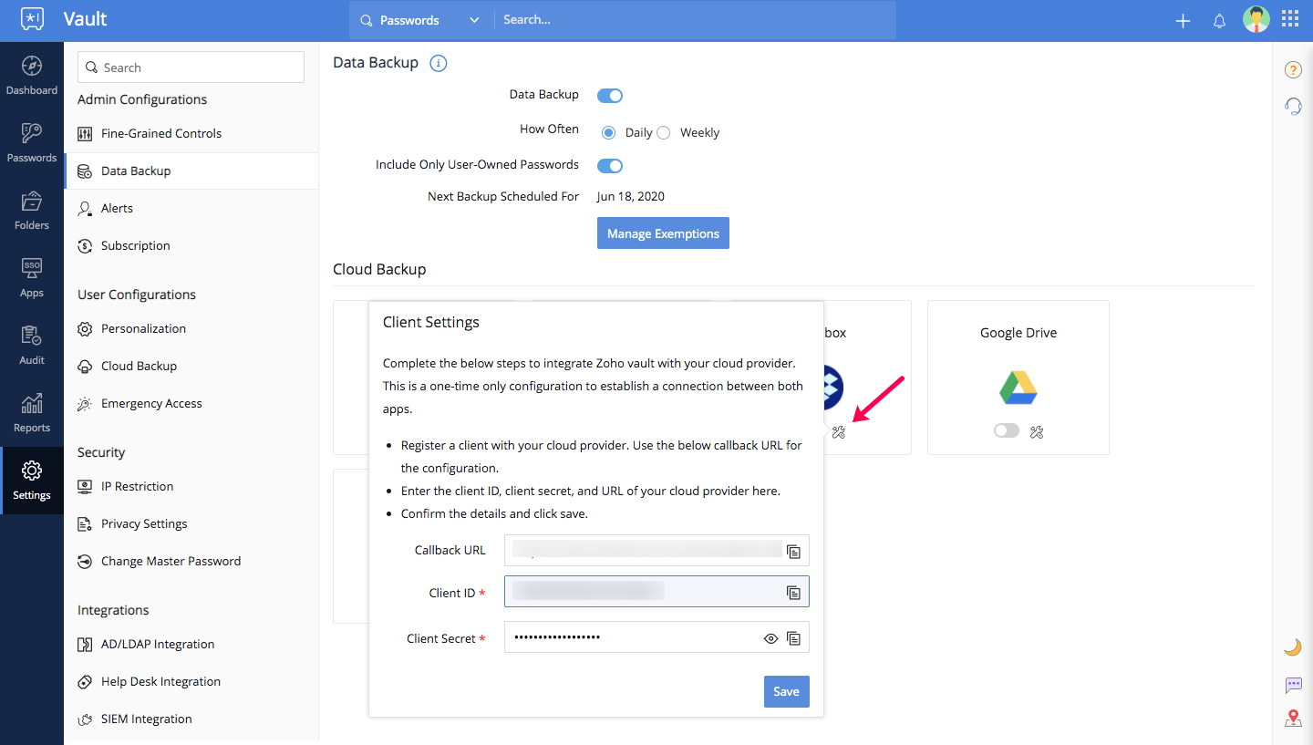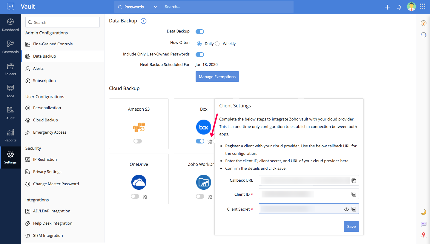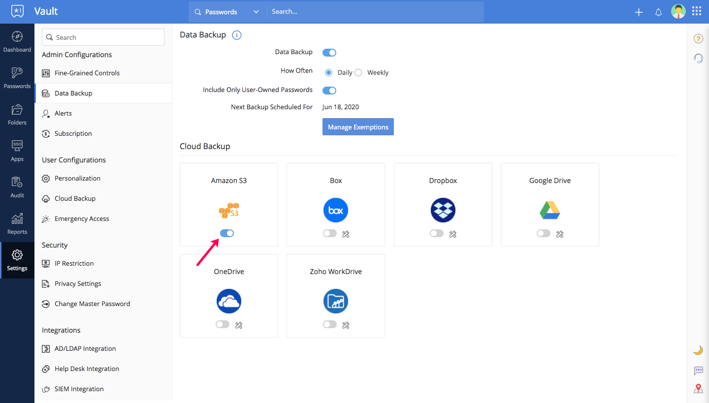Zoho Vaultは定期的にデータのバックアップコピーを、有効化した場合は、メールに送信します。また、クラウドストレージサービスに送信することで、すべてのバックアップコピーを一つの場所にまとめることも可能です。このドキュメントでは、管理者がユーザーのクラウドバックアップを有効化する手順を説明します。以下のクラウドストレージサービスがサポートされています。