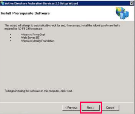 - Federationサービス名は初期設定に基づいてIISサーバー上にインストールされたSSL証明書により表示されます。次をクリックします。