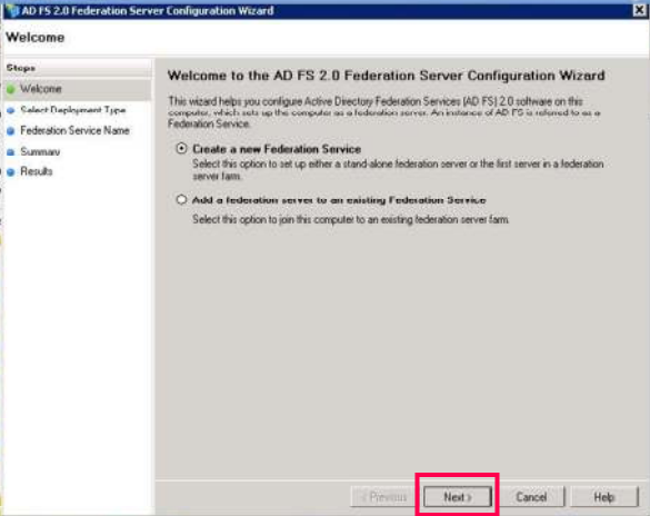 - 「新規 Federation サービスを作成」を選択し、クリックして「次へ」を進みます。