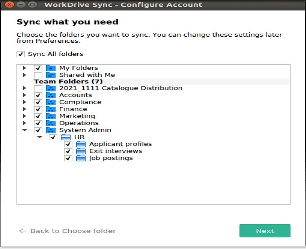 初期設定では、Zoho WorkDriveアカウント内のすべてのフォルダー(My フォルダー自分に共有Team フォルダー)が同期対象となります。また、選択的同期を利用して、これらのフォルダーやサブフォルダーを個別に選択して同期することも可能です。必要なフォルダーを選択し、をクリックしてください。