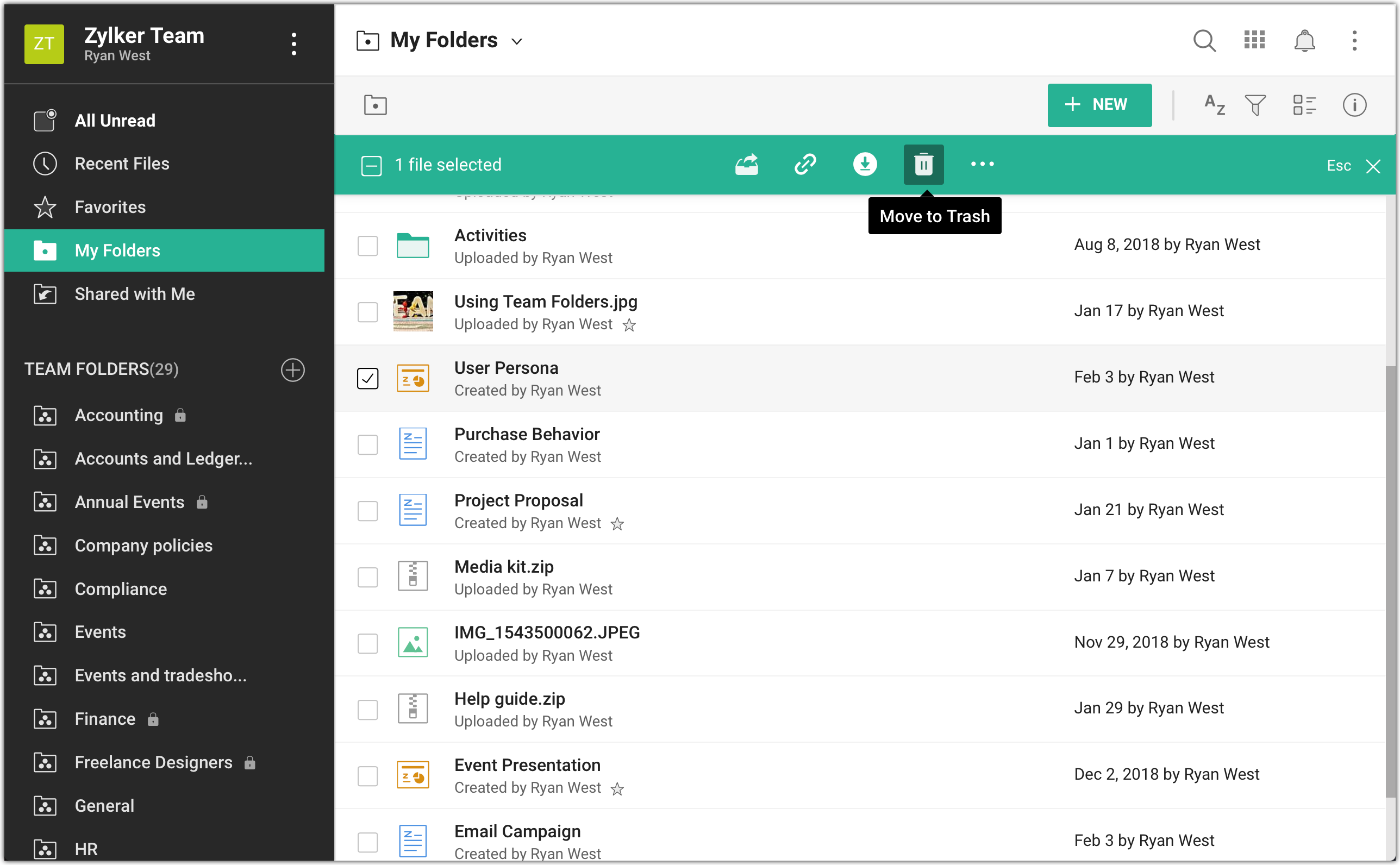 他のチームメンバーと共有されているファイルやフォルダをゴミ箱に入れると、それらのファイルやフォルダは彼らにとっても削除されます。