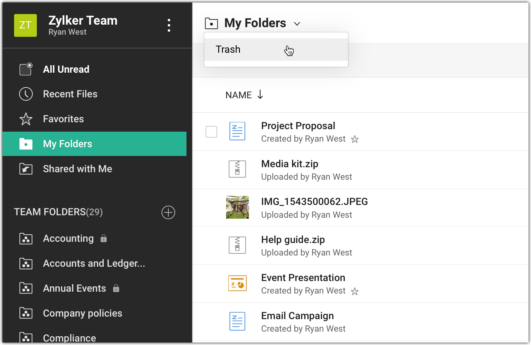 2. 左上の「マイフォルダ」の隣にあるドロップダウンアイコンをクリックし、 ゴミ箱 を選択します。