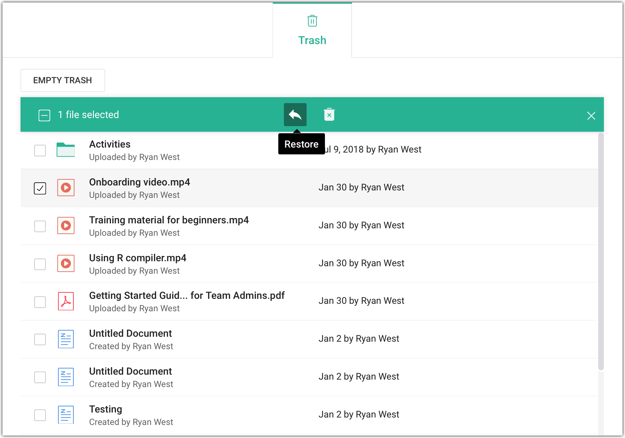 3. ゴミ箱タブが開きます。復元したいファイルまたはフォルダを選択し、復元アイコンをクリックしてください。 ゴミ箱リストの上部にある復元アイコンをクリックすることもできます。または、ファイルまたはフォルダの上にカーソルを合わせ、復元アイコンをクリックしてください。 をクリックして復元してください。