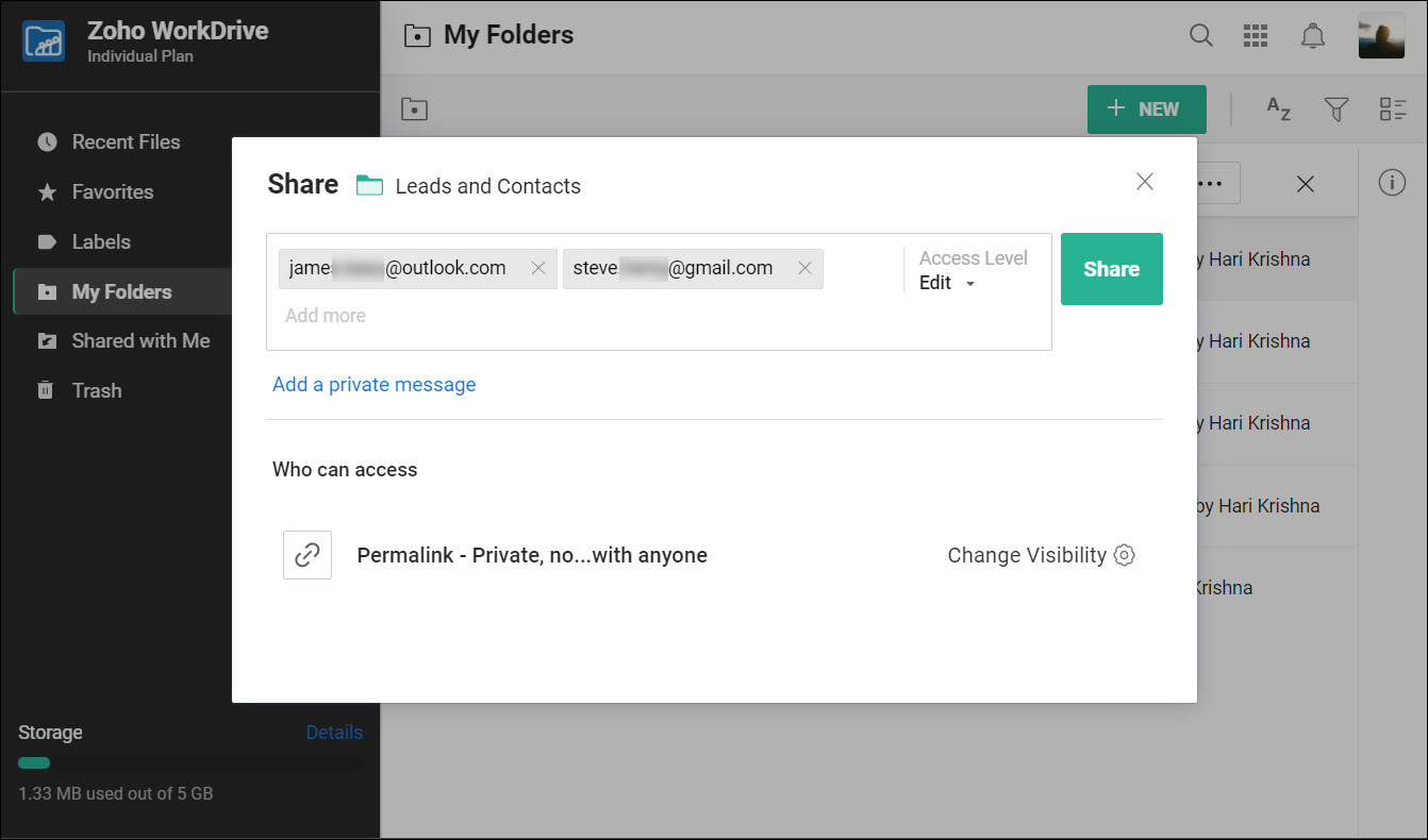2. WorkDriveのファイルまたはフォルダーをメールで共有する