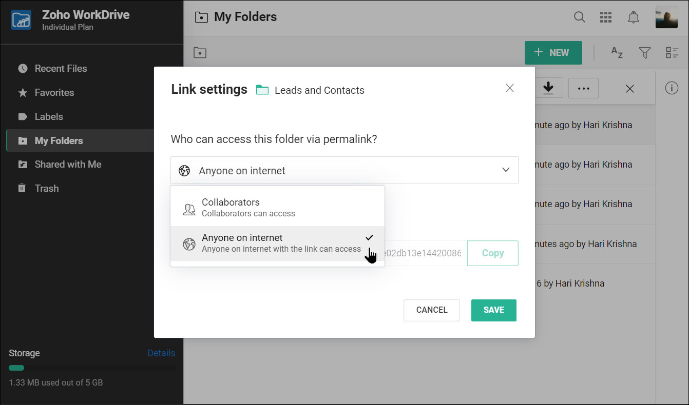 WorkDriveは、無制限のファイルバージョン活動タイムライン、およびアクセス統計に対応しています。